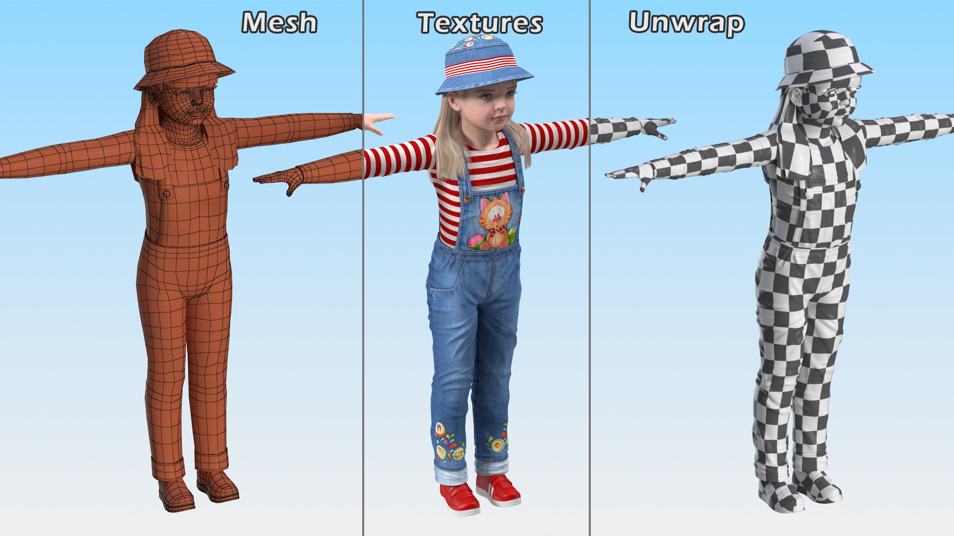 Child Girl Street Style Rigged is a three-dimensional model of a brave, cute female kid person in hat and popular, widespread denim overalls, which is casual dress wear (dress or clothes).