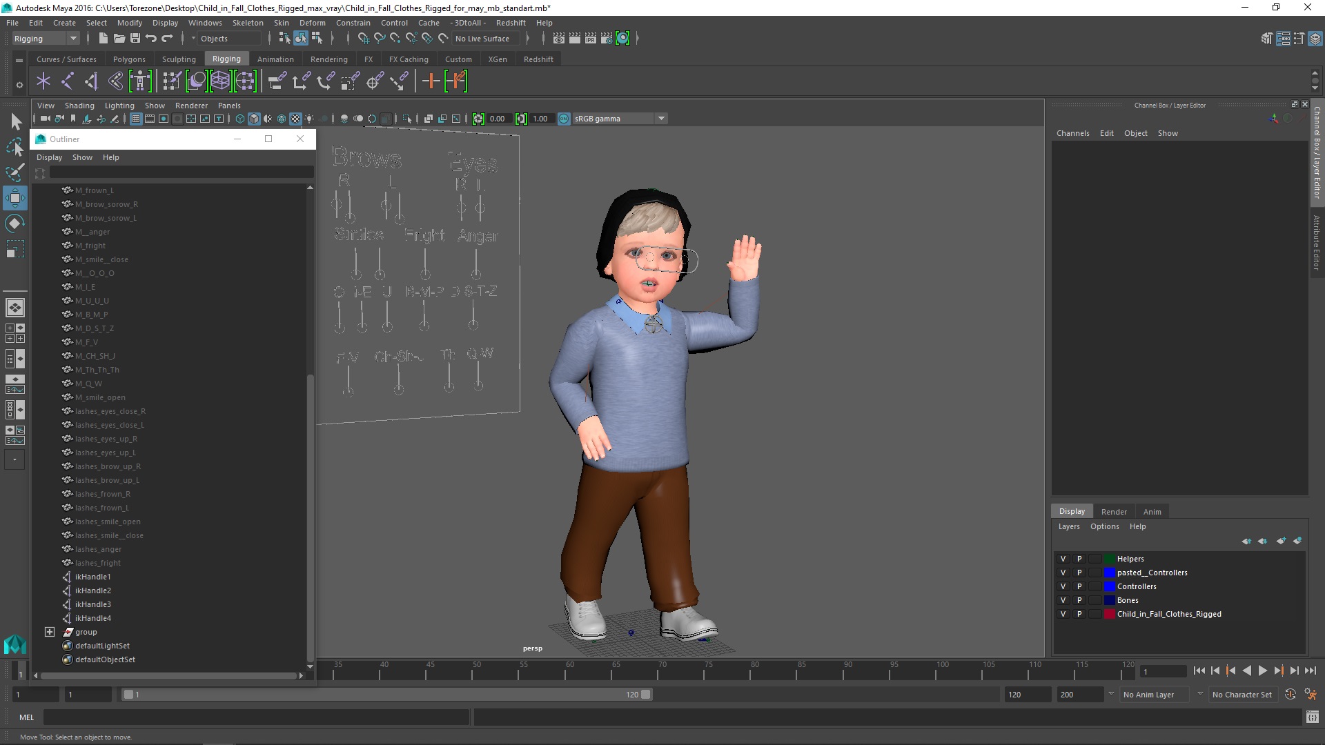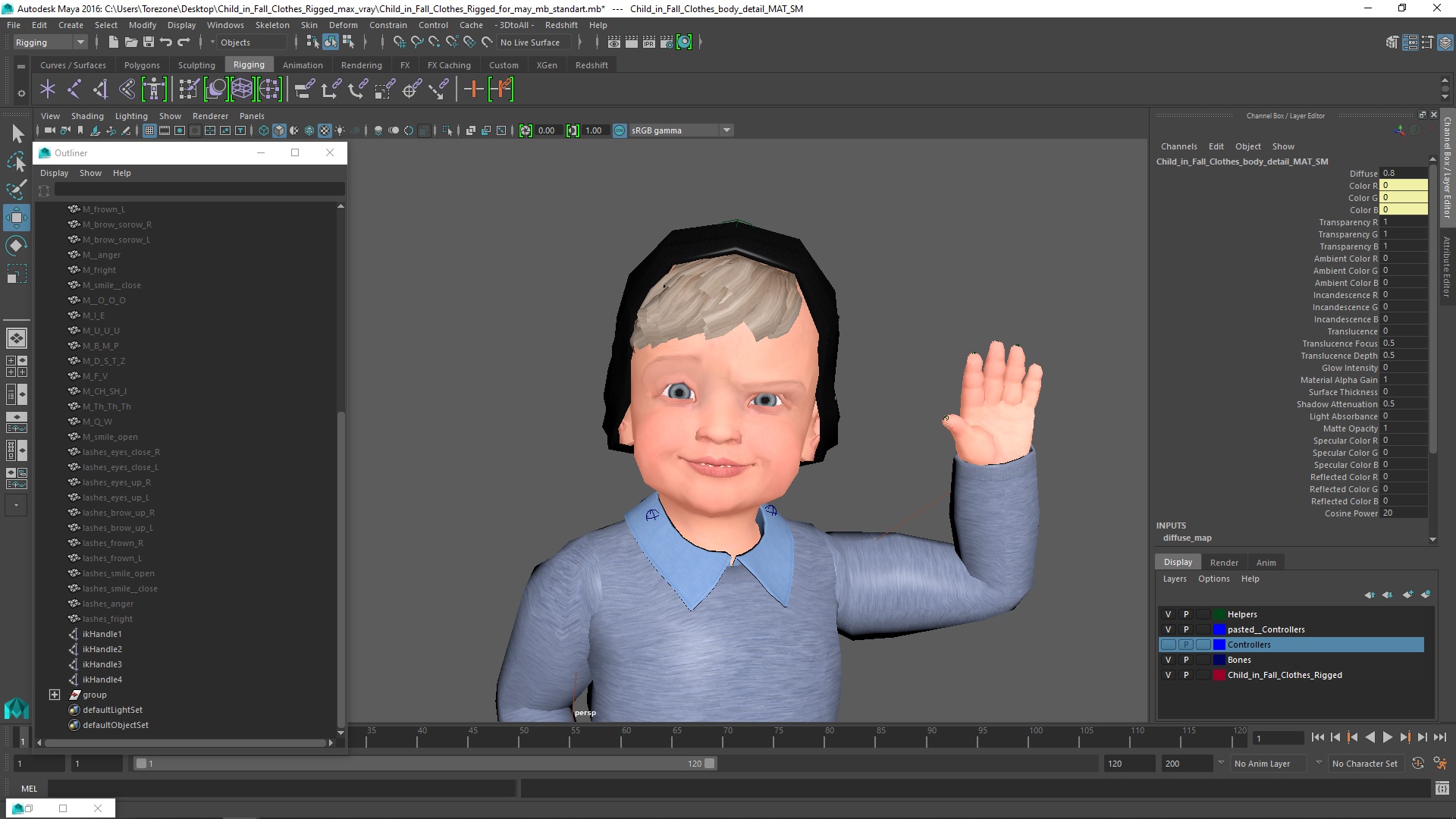 Child in Fall Clothes Rigged for Maya is fully rigged and is ready to be animated in Maya. You can easily position it the way you need or animate it the way your project requires. See the screenshots to get an idea of how rigging works. The pose of the model on the render images is an example and can be recreated using rig, it is not initially included into the product.