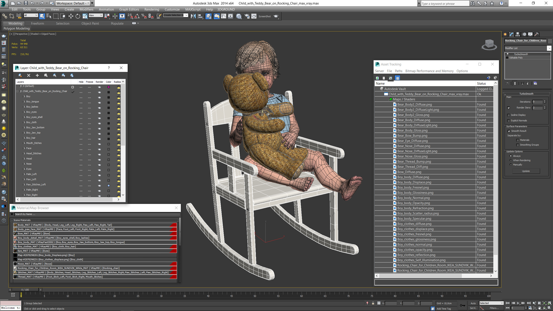 Child with Teddy Bear on Rocking Chair is a high quality, photo real 3d model that will enhance detail and realism to any of your rendering projects. The model has a fully textured, detailed design that allows for close-up renders, and was originally modeled in 3ds Max 2020 and rendered with V-Ray. Renders have no postprocessing!
