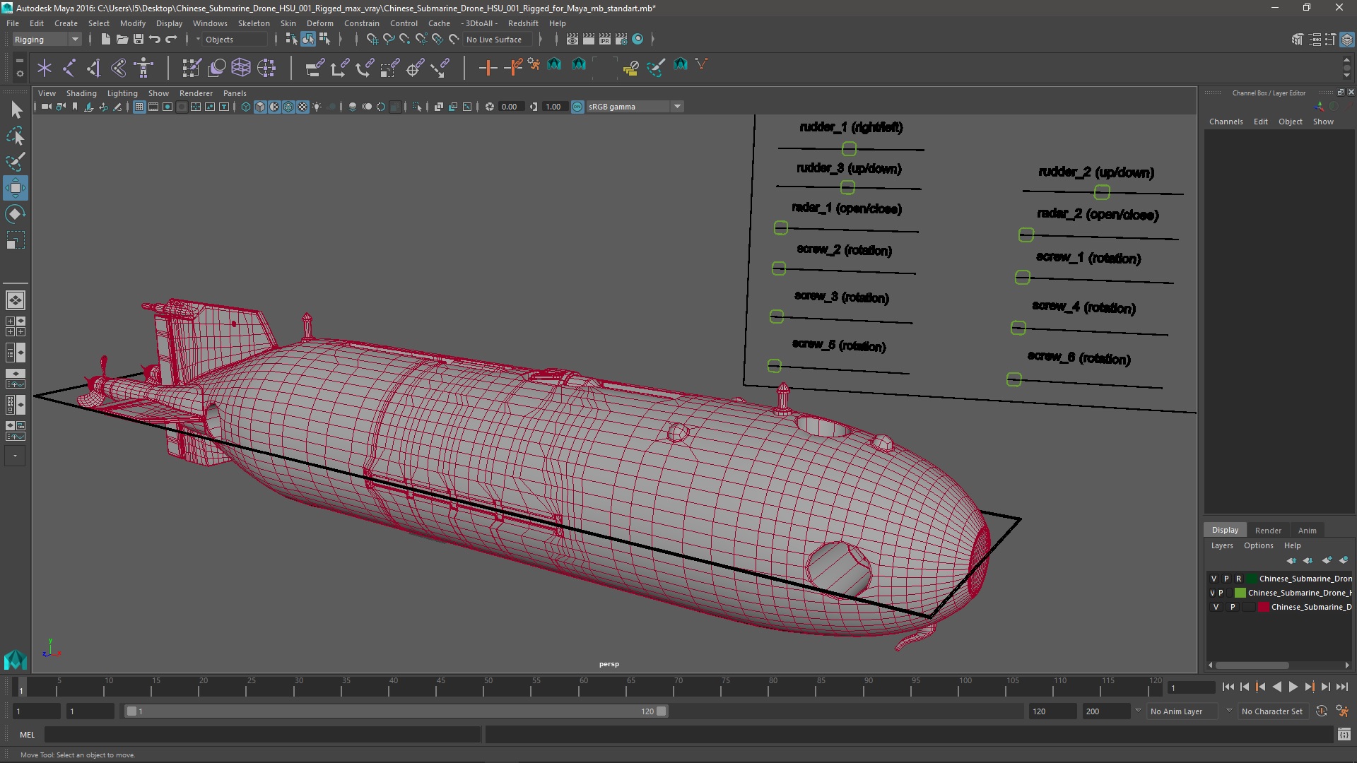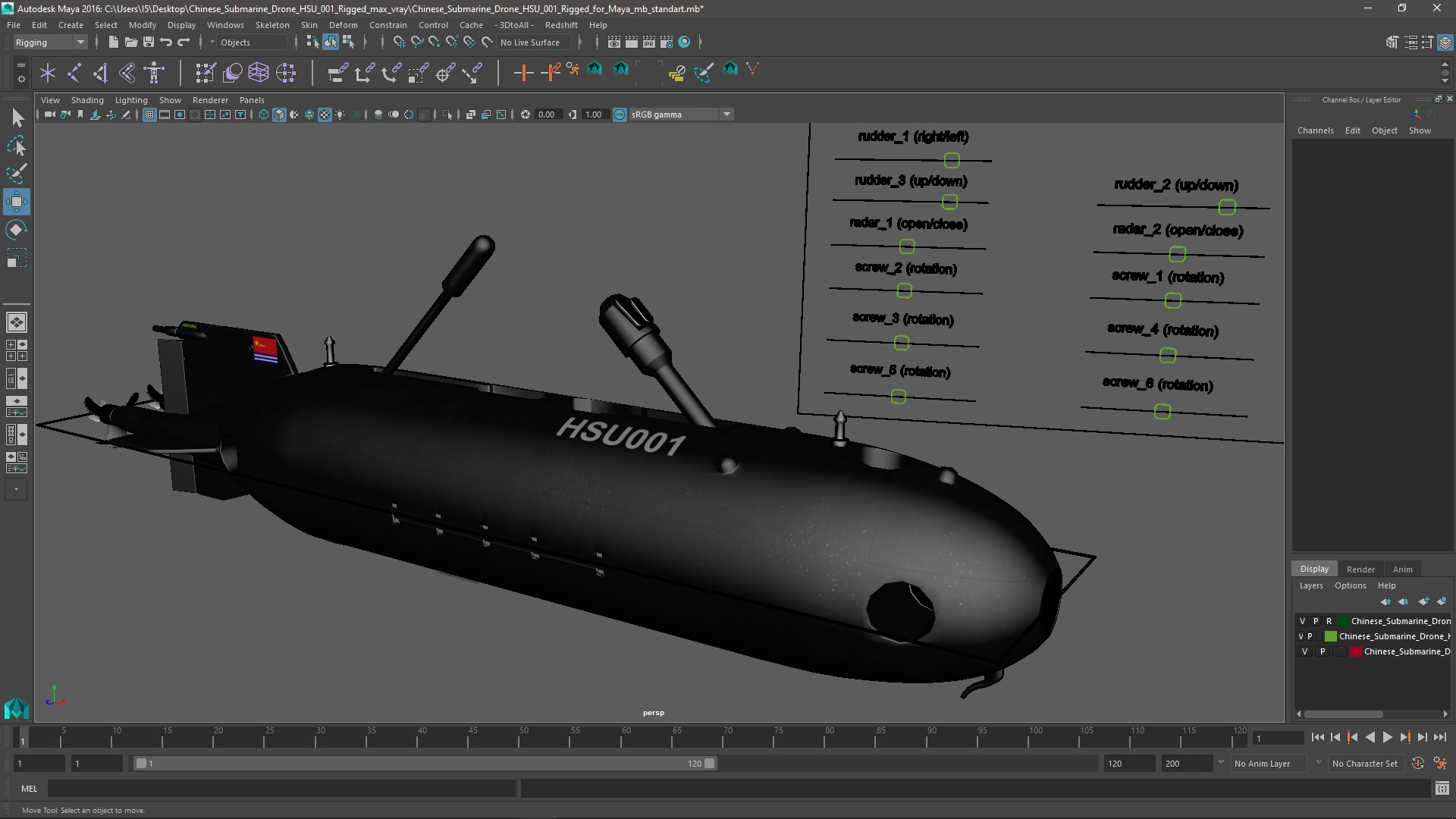 Chinese Submarine Drone HSU 001 Rigged for Maya is fully rigged and is ready to be animated in Maya. You can easily position it the way you need or animate it the way your project requires. See the screenshots to get an idea of how rigging works. The pose of the model on the render images is an example and can be recreated using rig, it is not initially included into the product.