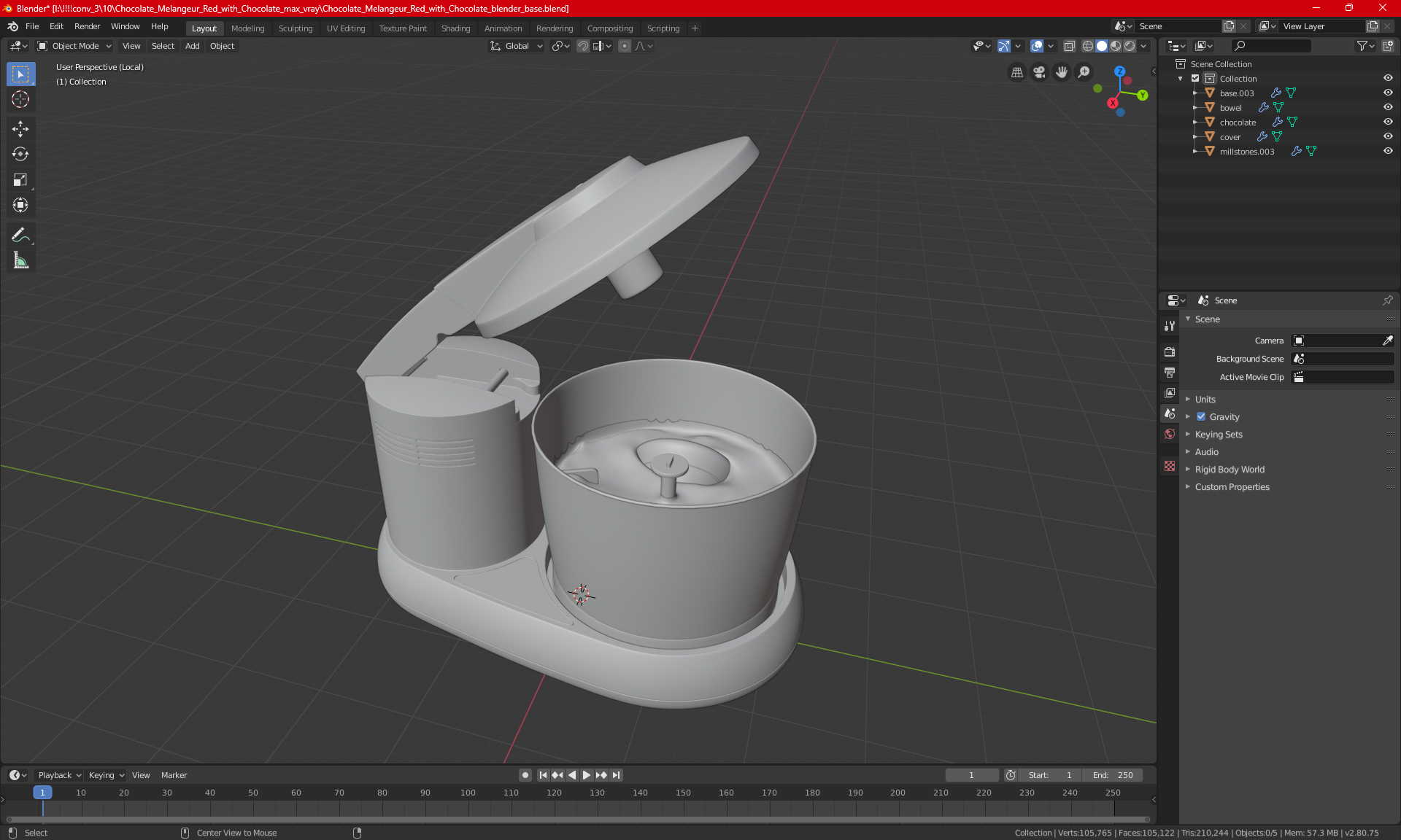Chocolate Melangeur Red with Chocolate is a high quality, photo real 3d model that will enhance detail and realism to any of your rendering projects. The model has a fully textured, detailed design that allows for close-up renders, and was originally modeled in 3ds Max 2020 and rendered with V-Ray. Renders have no postprocessing!