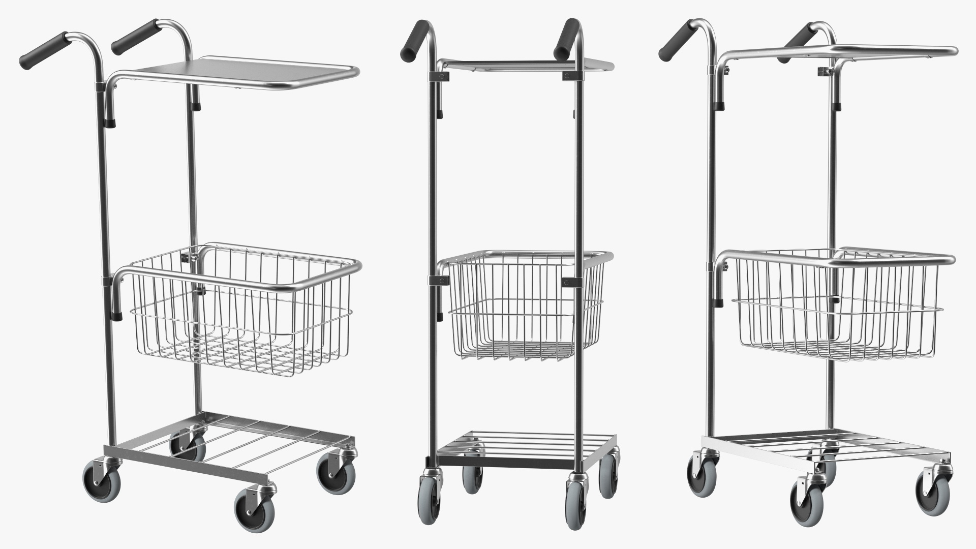 Chrome Mini Trolley with Shelf and Basket is a three-dimensional model of trolley type, wheeled, metal, special, cart like, carrier device, which designed to organize and collecting various items indoor.