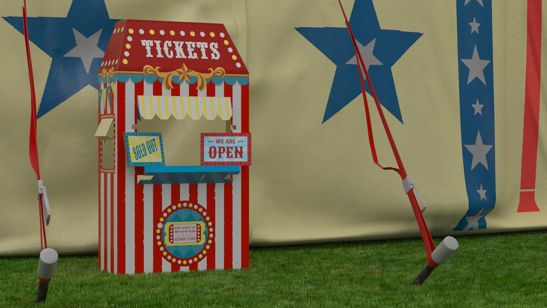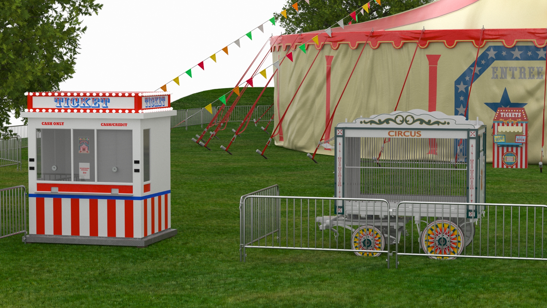 Circus Tent Setup and Transport Truck with Fur is a three-dimensional model of fenced area with truck, kiosk (booth), grass field (meadow), circus trailer and pair of large circus tents which are circus tent type constructions, and which are canvas roof structures designed for circus and festival business.