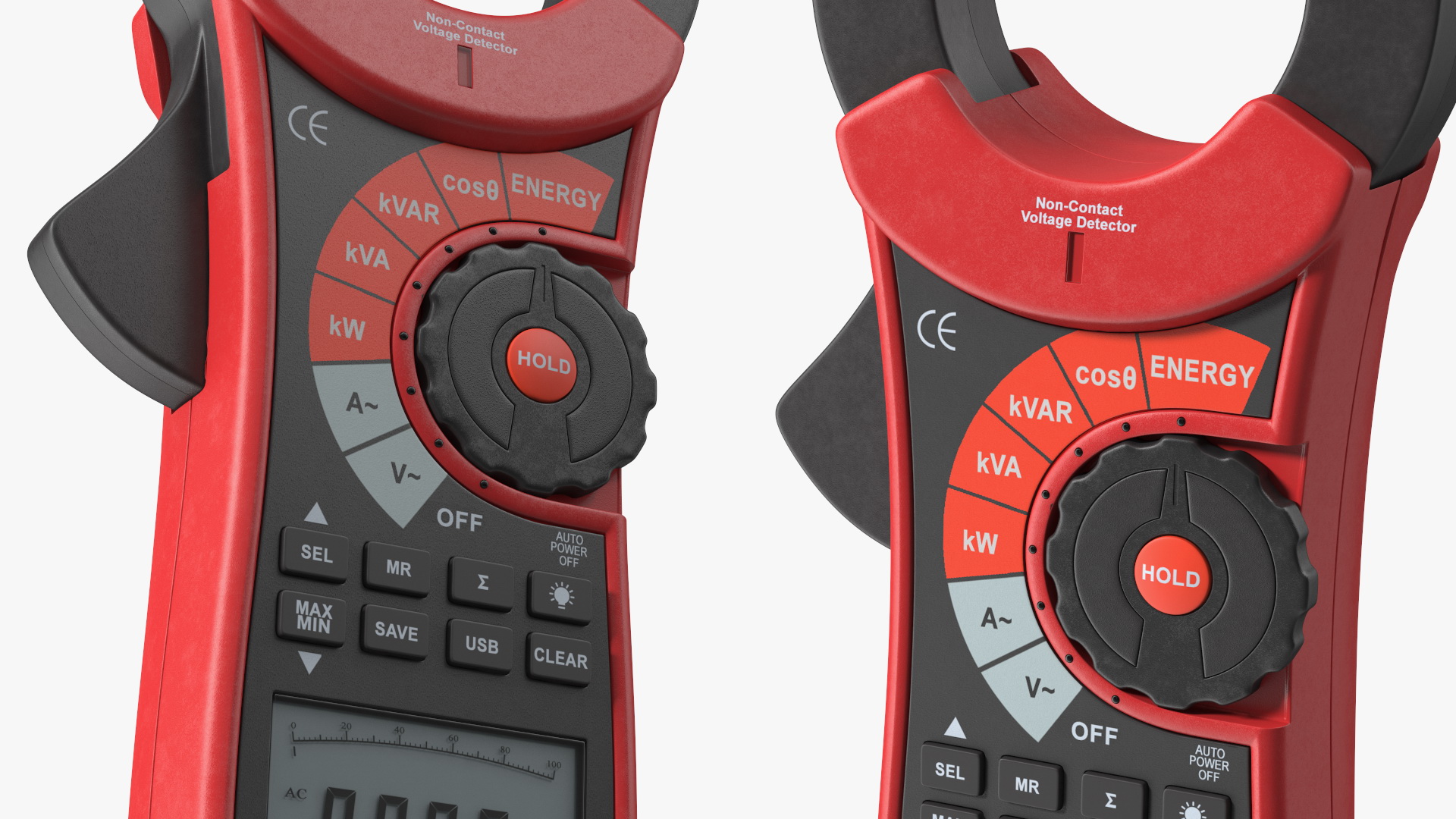 Clamp Digital Wattmeter Red is a three-dimensional model of a special, portable watt hour test meter with LCD display.