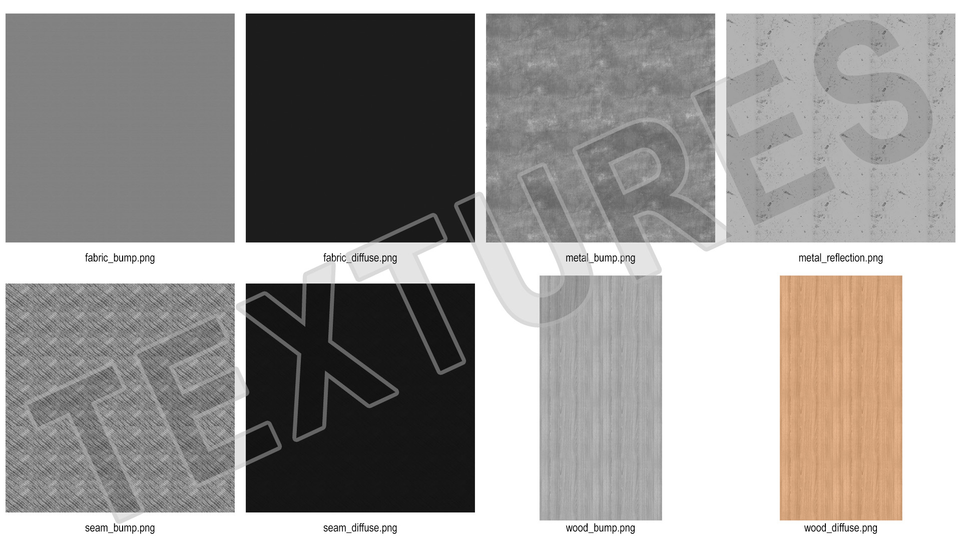 All textures and materials are included and mapped. (All colors can be easily modified.)