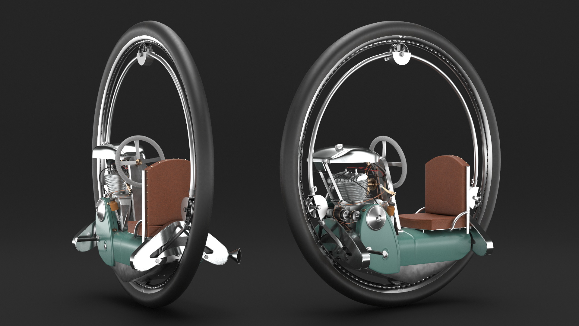 The monowheel is designed with highly detailed textures, including metal components, rubberized tires, and mechanical parts, giving it a worn yet functional appearance. It highlights the charm of early motorized vehicles with an emphasis on authenticity and historical design.
