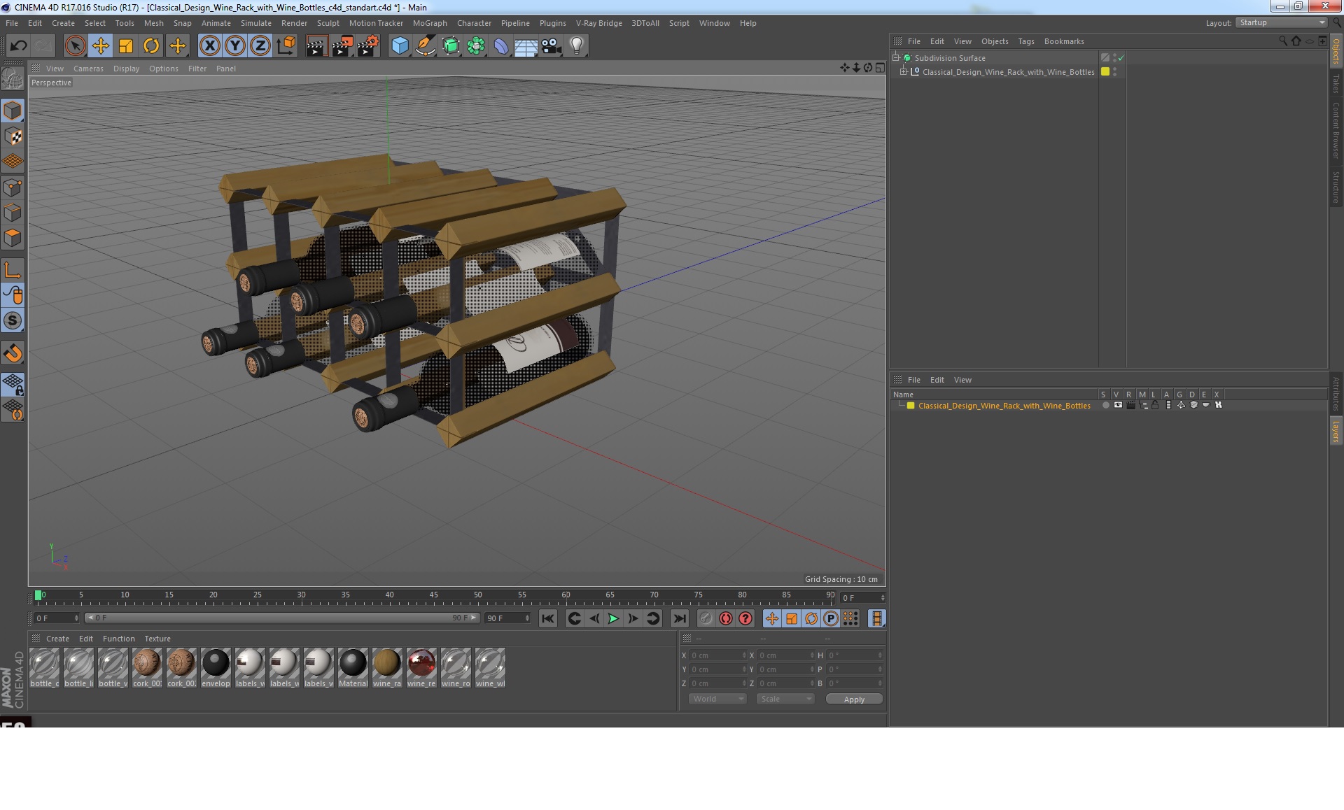 Classical Design Wine Rack with Wine Bottles is a high quality, photo real 3d model that will enhance detail and realism to any of your rendering projects. The model has a fully textured, detailed design that allows for close-up renders, and was originally modeled in 3ds Max 2020 and rendered with V-Ray. Renders have no postprocessing!