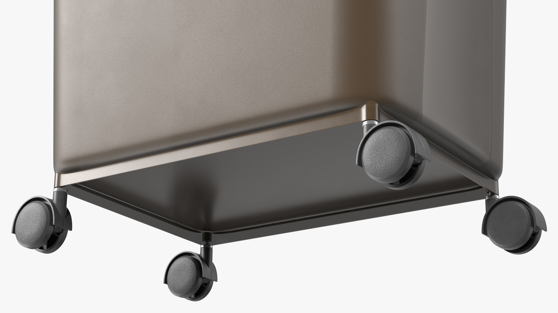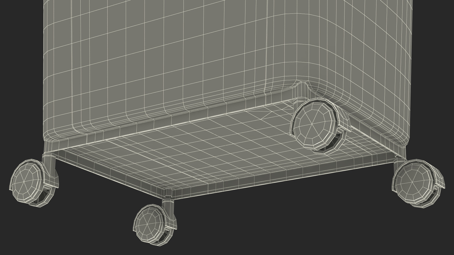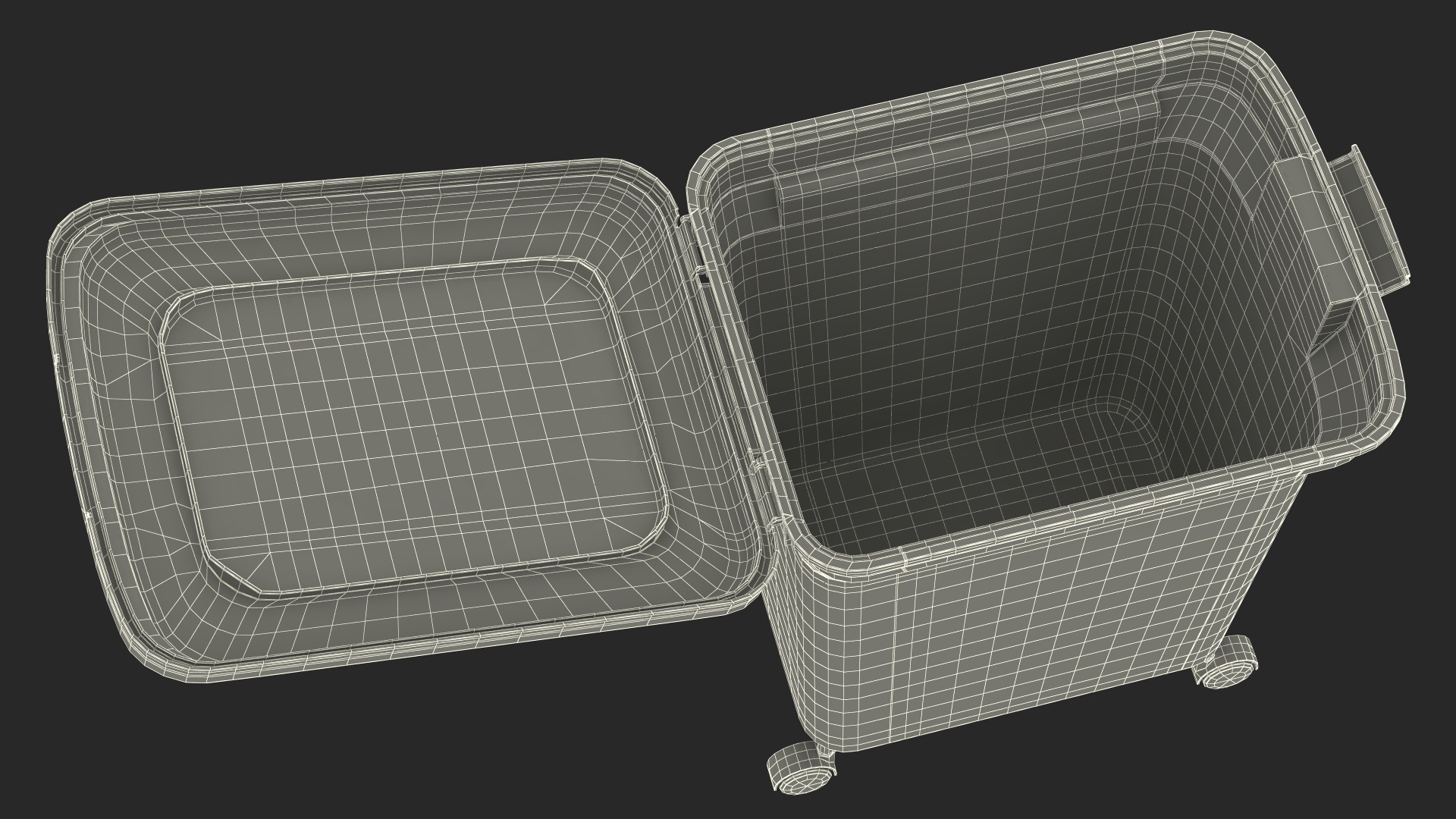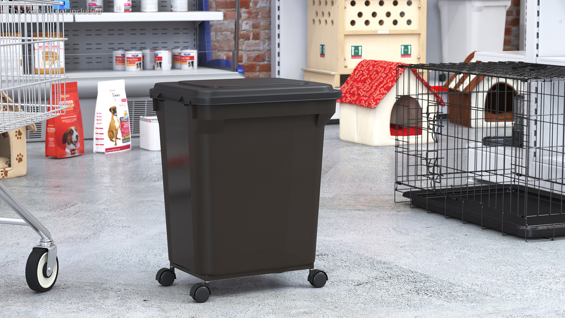 Clear Plastic Storage Box Dark is a three-dimensional model of wheeled plastic storage container which serves as a specialized mobile box designed specifically for storing pet food.