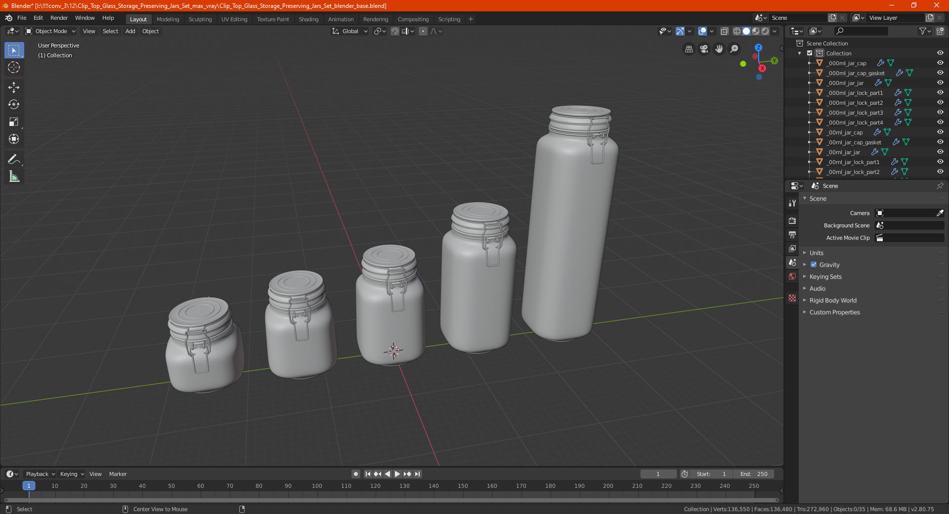 Clip Top Glass Storage Preserving Jars Set is a high quality, photo real 3d model that will enhance detail and realism to any of your rendering projects. The model has a fully textured, detailed design that allows for close-up renders, and was originally modeled in 3ds Max 2020 and rendered with V-Ray. Renders have no postprocessing!