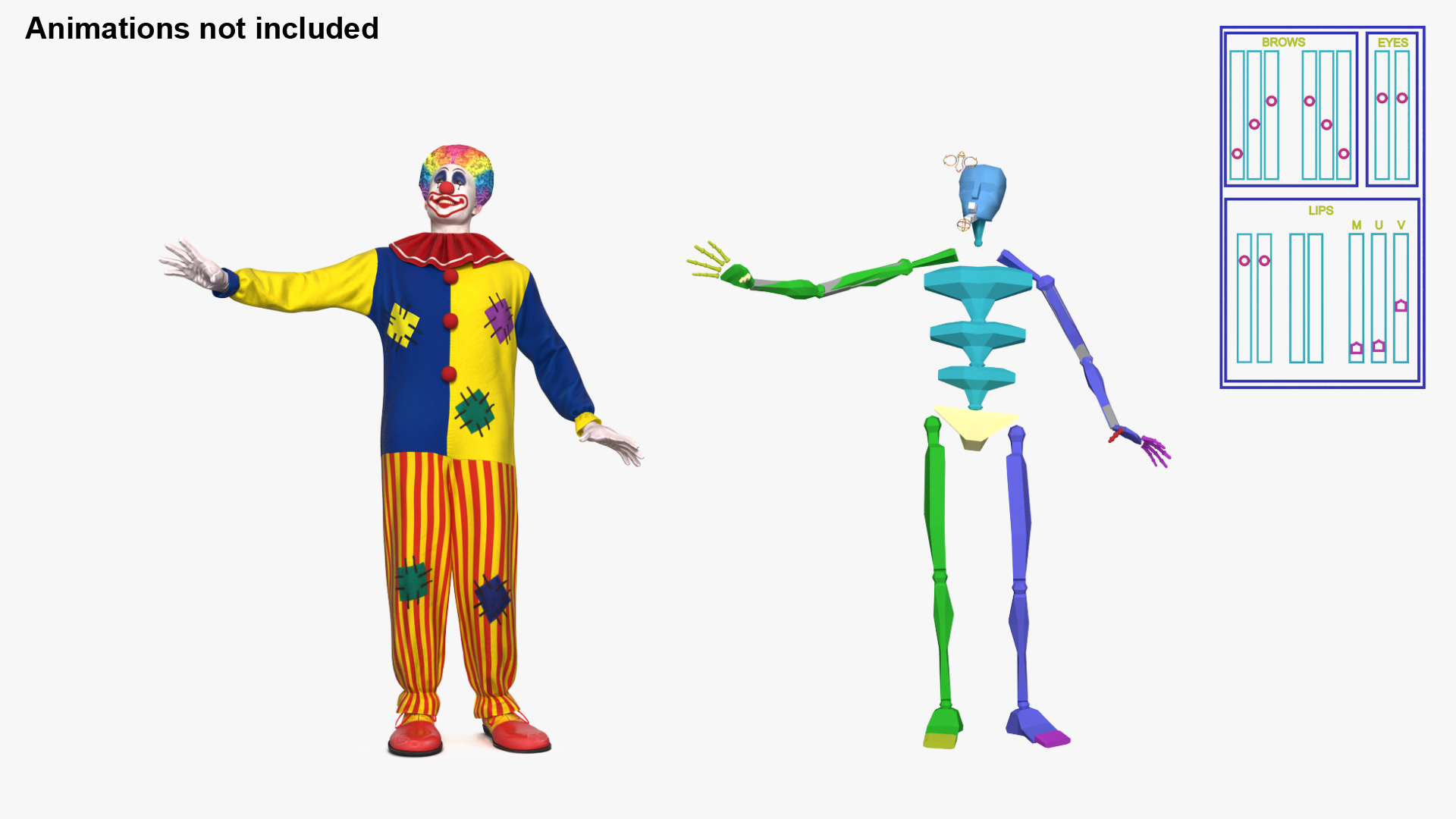 Clown Costume Rigged is fully rigged and is ready to be animated. You can easily position it the way you need or animate it the way your project requires using helpers in 3D Studio Max. See the turntable to get an idea of how rigging works.