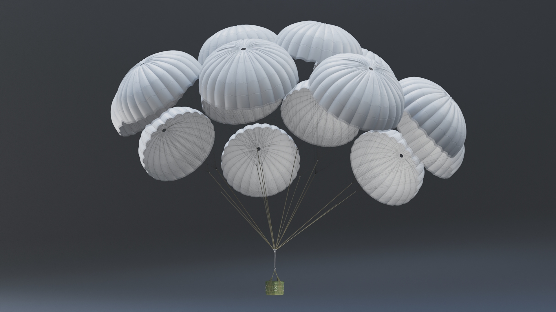 Cluster of Military Parachutes with Cargo is a 3d model of a military airdrop system, featuring a coordinated group of parachutes carrying cargo containers, designed to represent tactical air delivery methods for military supplies and equipment.