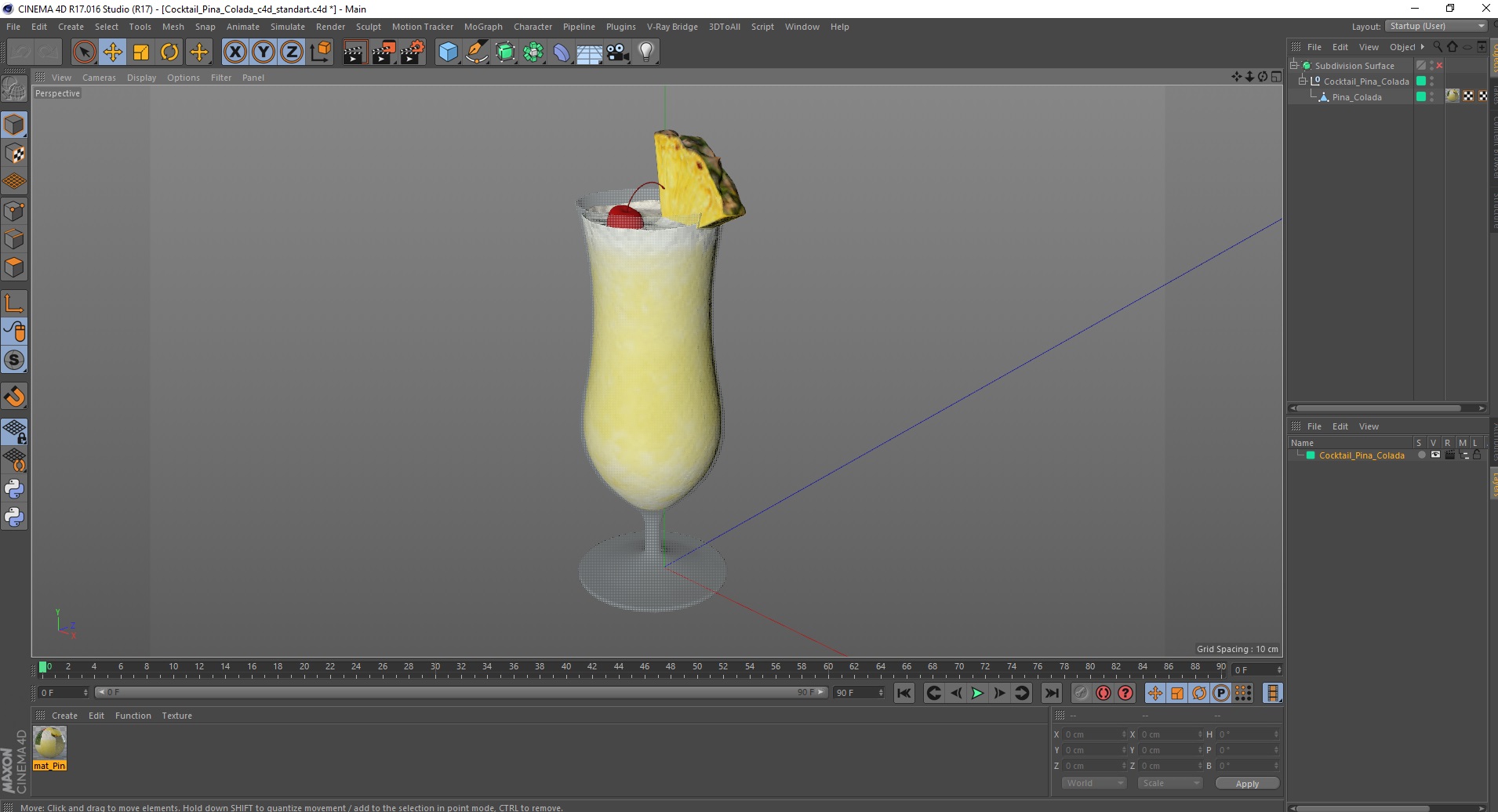 Cocktail Pina Colada is a three-dimensional model of classic tropical cocktail without straw, which is a popular beverage known for its smooth, creamy texture and refreshing taste.