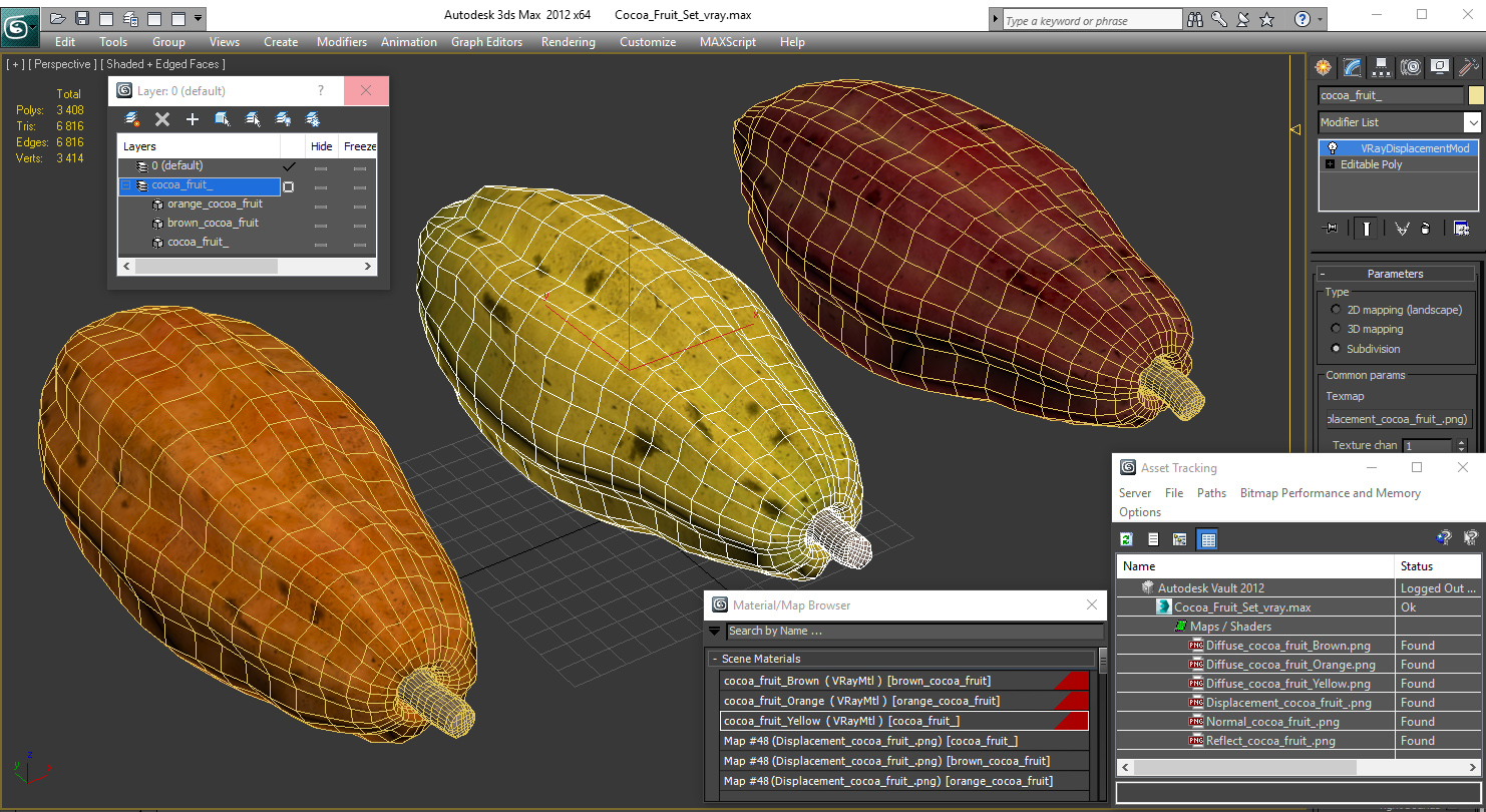 Cocoa Fruit Set is a high quality, photo real 3d model that will enhance detail and realism to any of your rendering projects. The model has a fully textured, detailed design that allows for close-up renders, and was originally modeled in 3ds Max 2020 and rendered with V-Ray. Renders have no postprocessing!