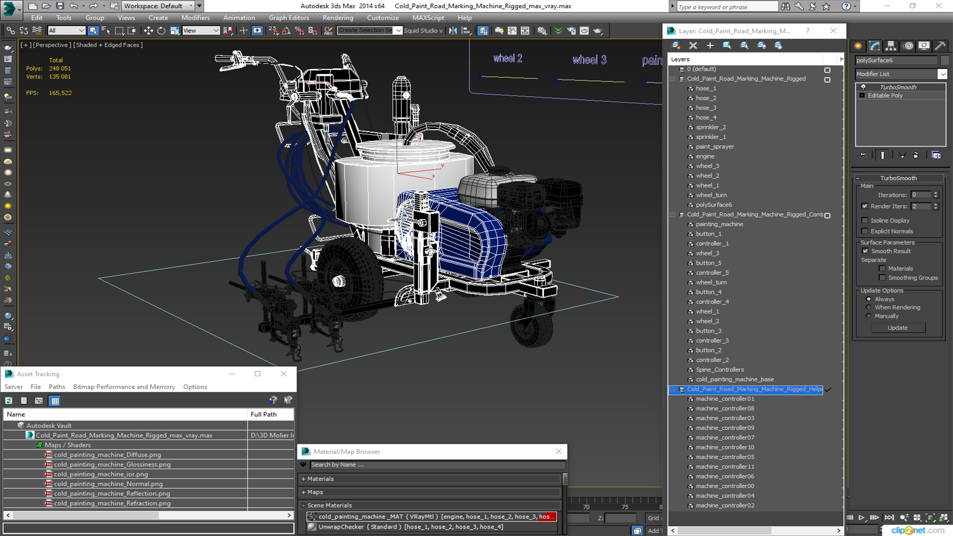 Cold Paint Road Marking Machine Rigged is a three-dimensional model of hydraulic road line marking machine which is a road stripper wheeled device which is designed to airports, car parks, and wide range of other applicators.