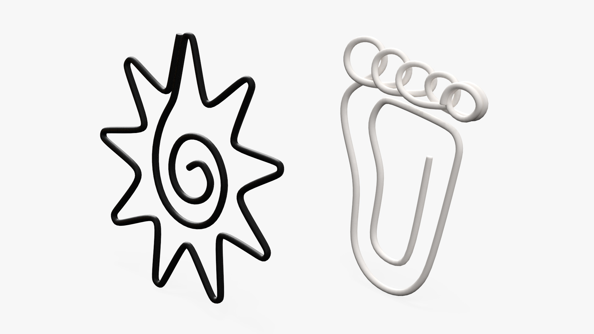 Colored Curly Paper Clips is a three-dimensional model of set of thin metal wire tools, which are designed to hold sheets of paper together.