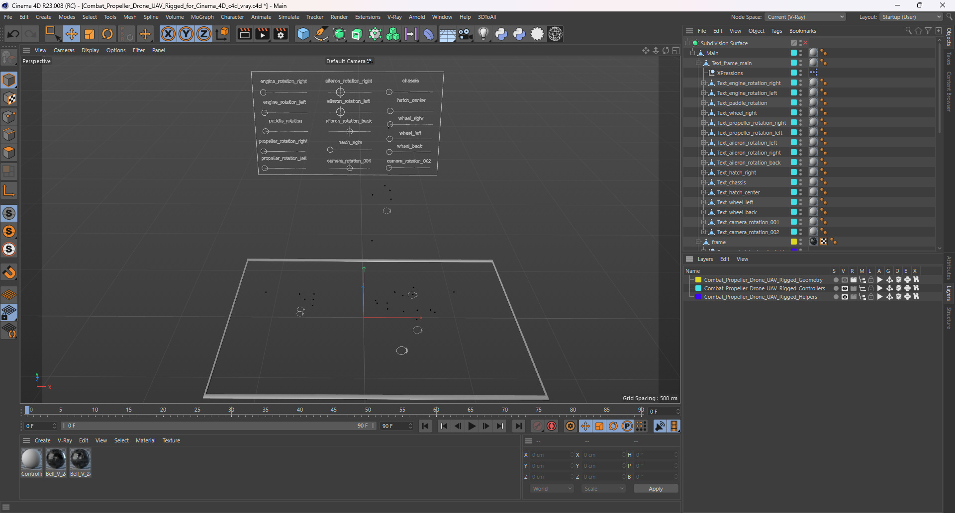 Combat Propeller Drone UAV Rigged for Cinema 4D is fully rigged and is ready to be animated in Cinema 4D. You can easily position it the way you need or animate it the way your project requires. See the screenshots to get an idea of how rigging works. The pose of the model on the render images is an example and can be recreated using rig, it is not initially included into the product.