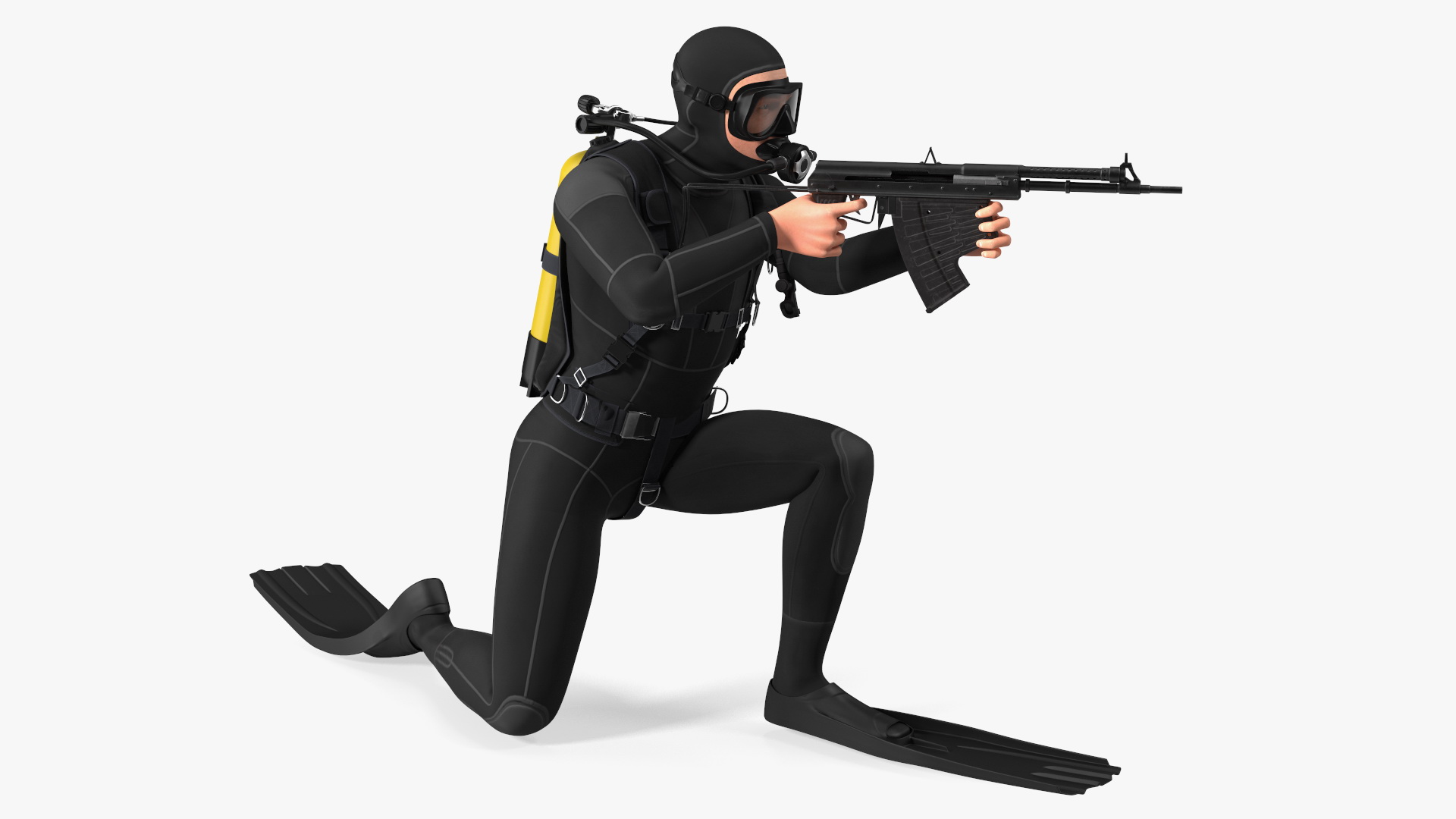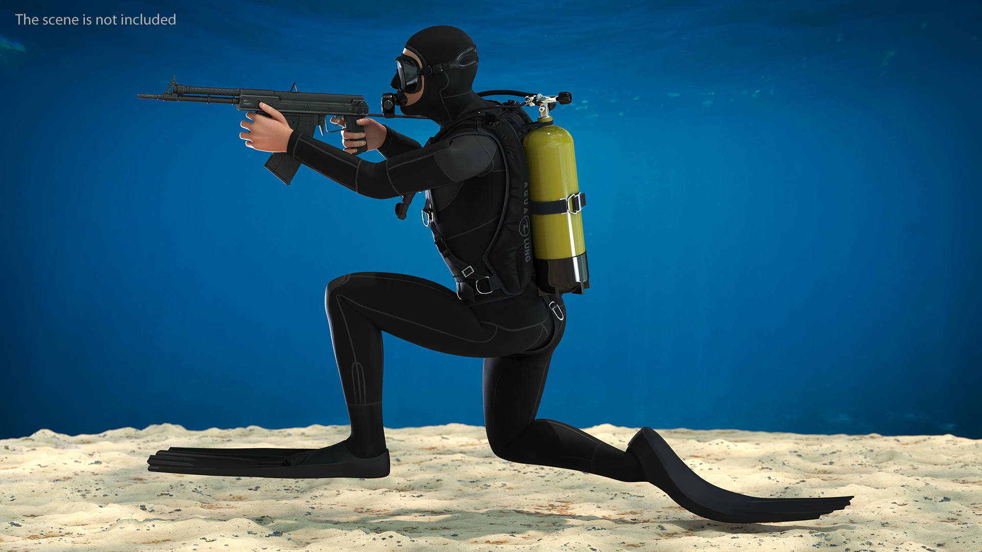 Combat Swimmer with Underwater Rifle APS Rigged is a 3d model of combat diver who is trained to dive or swim underwater in a tactical capacity that includes police or military work. The diver is armed with a specially designed weapon for underwater shooting APS - an underwater assault rifle that was adopted in the Soviet era and capable of hitting a target at a range of 30 meters with an immersion depth of 5 m. It fires a 120mm long dart or flechette, which is relatively stable traveling underwater. The machine itself was designed to deal with underwater saboteurs and scouts of a potential enemy, as well as for self-defense from marine predators like sharks.