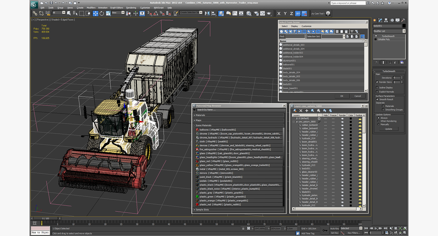 Combine CMC Saturne 5800 with Harvester Trailer is a high quality, photo real 3d model that will enhance detail and realism to any of your rendering projects. The model has a fully textured, detailed design that allows for close-up renders, and was originally modeled in 3ds Max 2020 and rendered with V-Ray. Renders have no postprocessing!