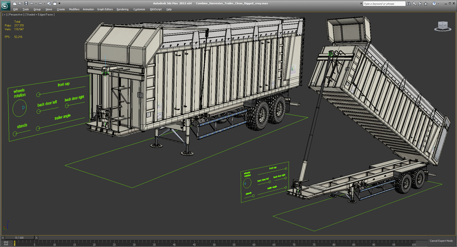 Combine Harvester Trailer Clean Rigged is fully rigged and is ready to be animated. You can easily position it the way you need or animate it the way your project requires using helpers in 3D Studio Max. See the turntable to get an idea of how rigging works.