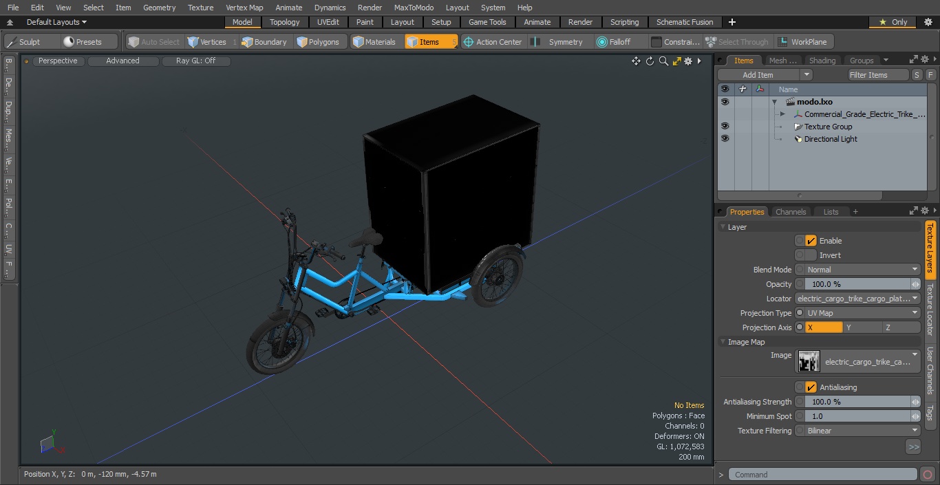 Commercial Grade Electric Trike with Cargo Box is a three-dimensional model of an EV type, utility style, environmental, commercial grade, ECO type designed, cargo type, heavy-duty, electric trike vehicle.