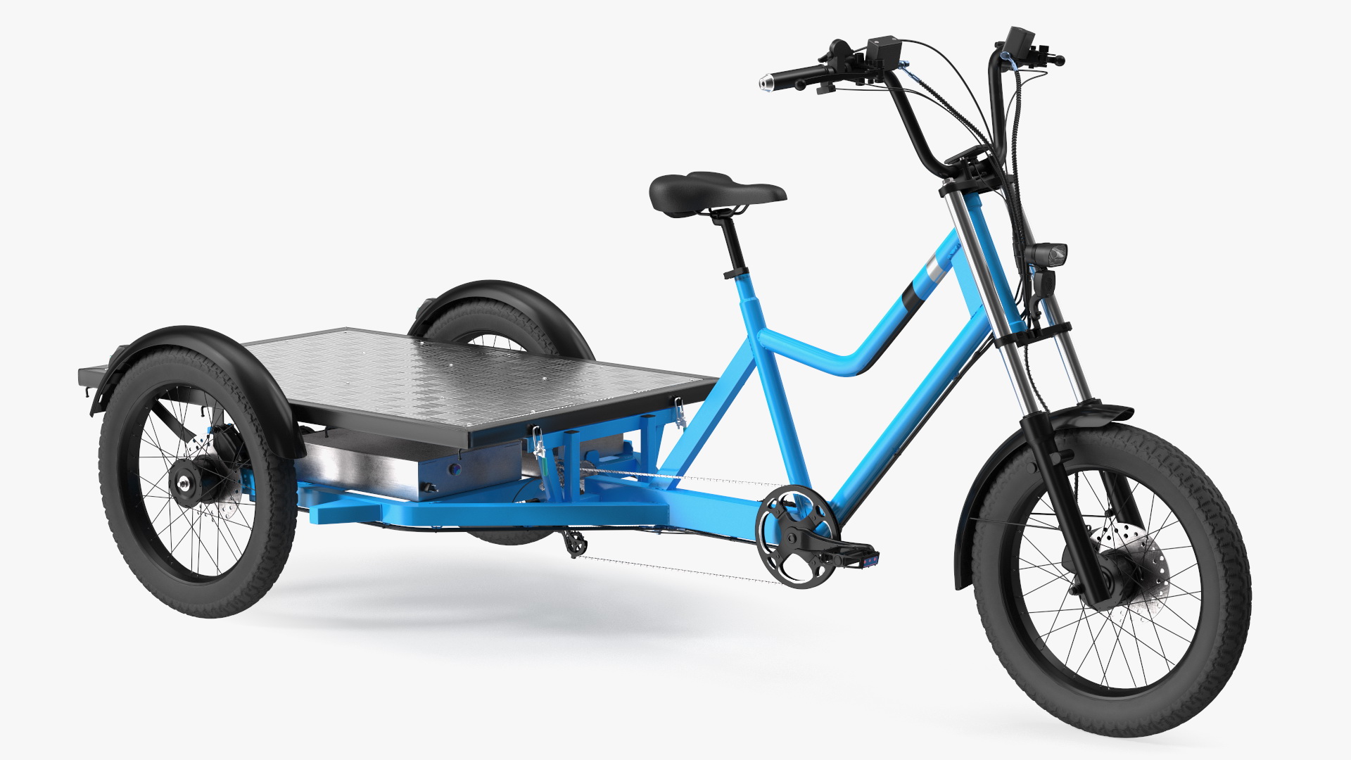 Commercial Grade Electric Trike with Flatbed Rigged is a three-dimensional model of an utility style, EV, commercial grade, cargo type, heavy-duty, electric trike vehicle.