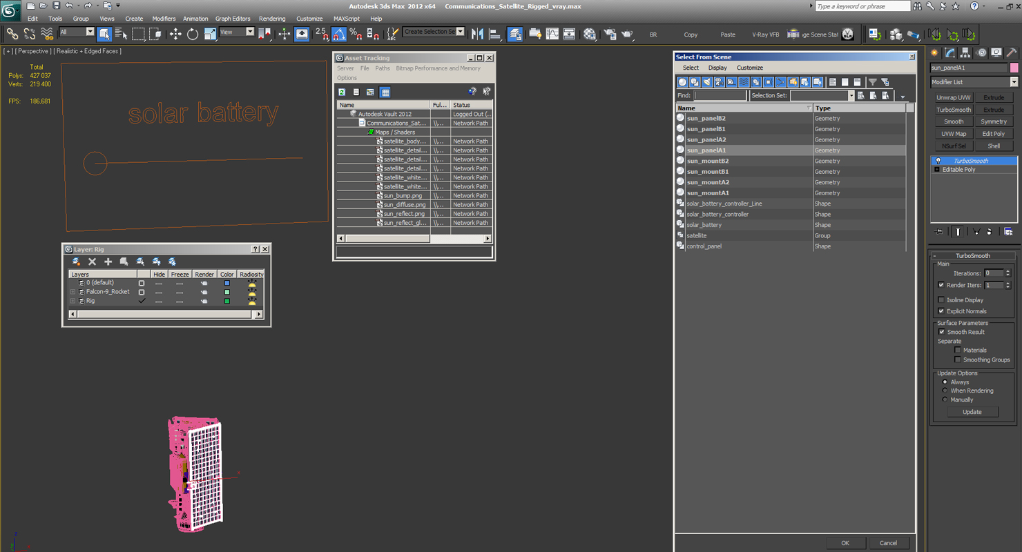 Communications Satellite Rigged is fully rigged and is ready to be animated. You can easily position it the way you need or animate it the way your project requires using helpers in 3D Studio Max. See the turntable to get an idea of how rigging works.
