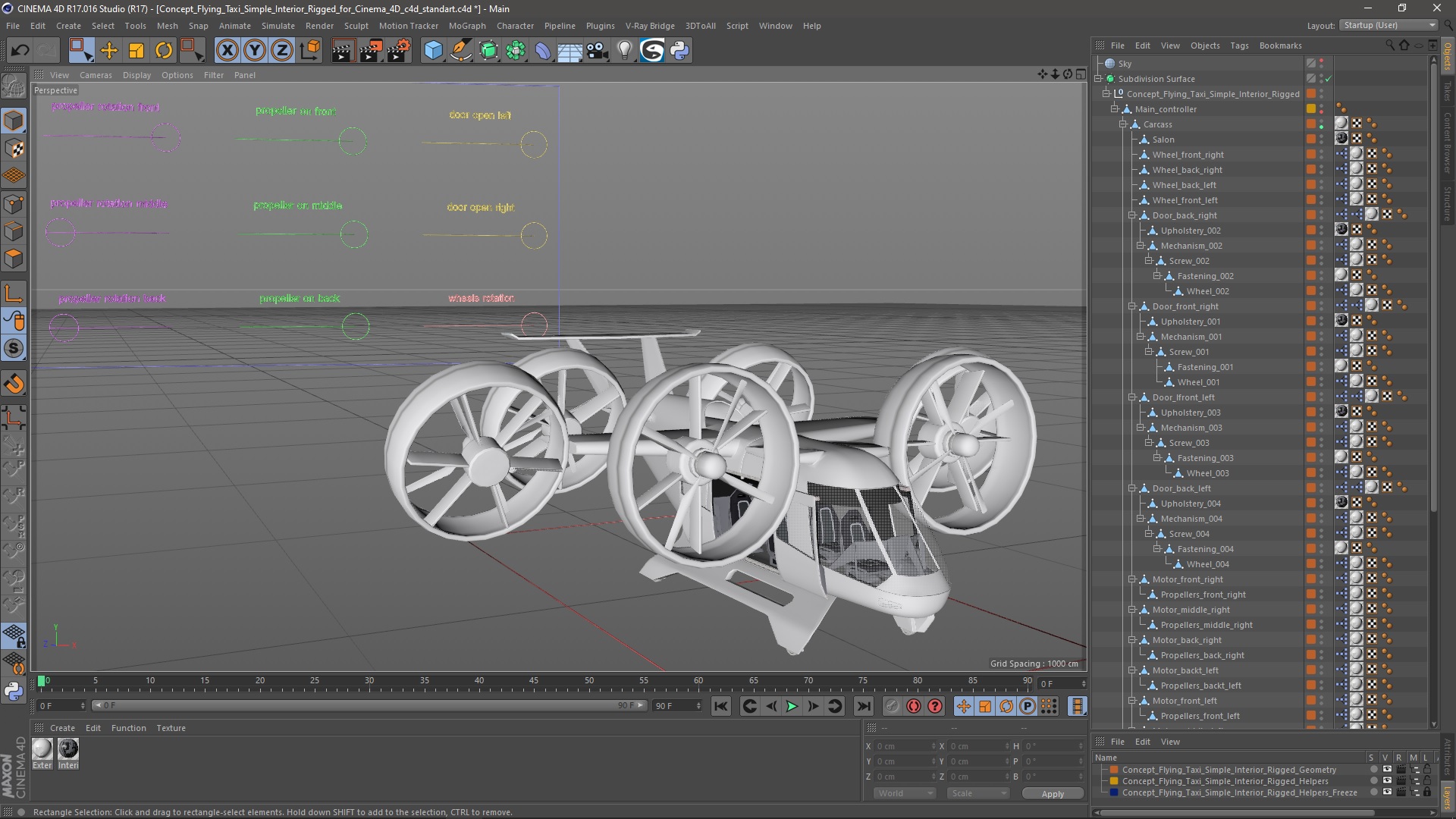 Concept Flying Taxi Simple Interior Rigged for Cinema 4D is fully rigged and is ready to be animated in Cinema 4D. You can easily position it the way you need or animate it the way your project requires. See the screenshots to get an idea of how rigging works. The pose of the model on the render images is an example and can be recreated using rig, it is not initially included into the product.