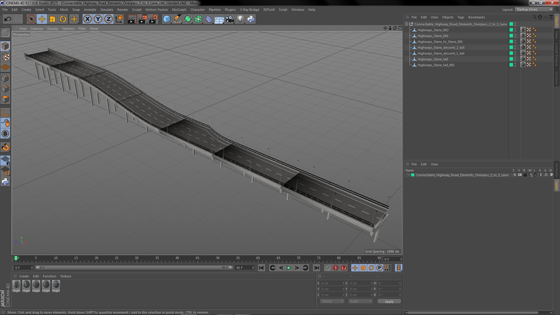 Connectable Highway Road Elements Overpass 2 to 3 Lane is a 3d model of main road, especially one that connects towns or cities.