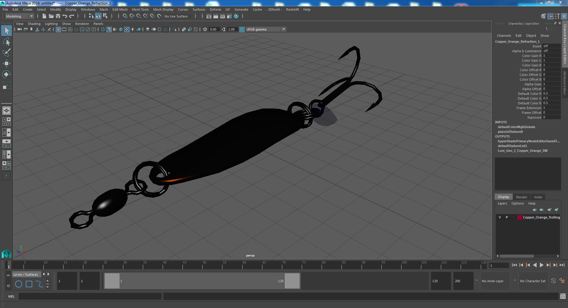 Copper Orange Trolling Spoon Lure is a high quality, photo real 3d model that will enhance detail and realism to any of your rendering projects. The model has a fully textured, detailed design that allows for close-up renders, and was originally modeled in 3ds Max 2020 and rendered with V-Ray. Renders have no postprocessing!