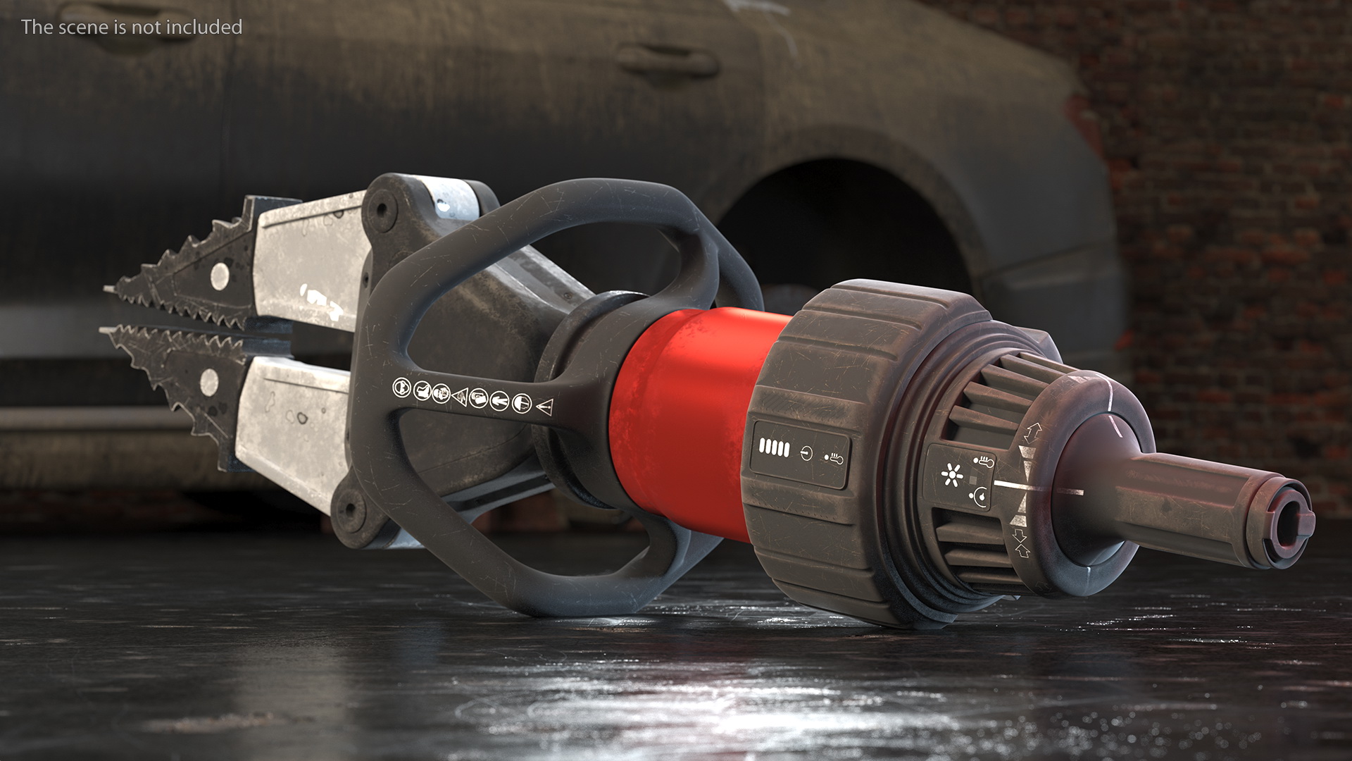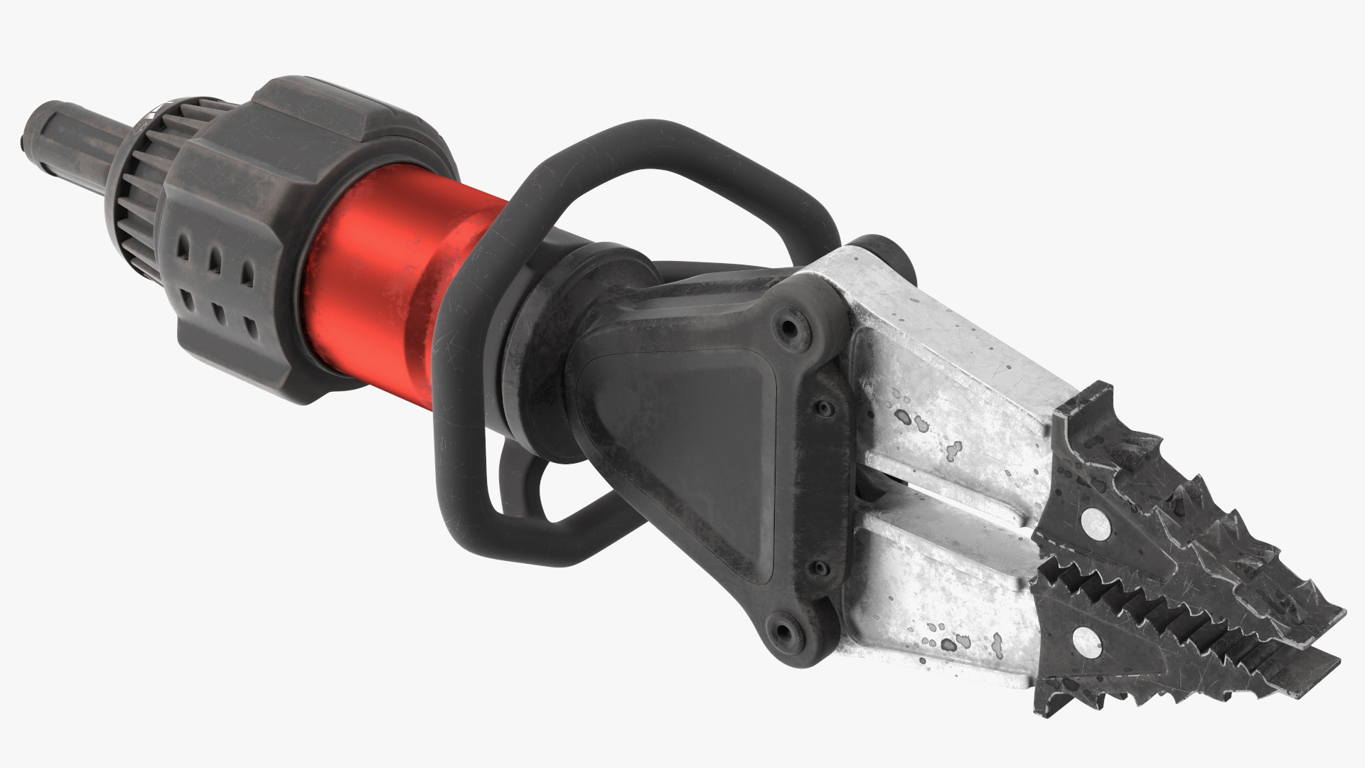 Cordless Handheld Spreader Tool Dirty Rigged is a three-dimensional model of a heavy duty, special, portable, electric battery powered rescue tool.