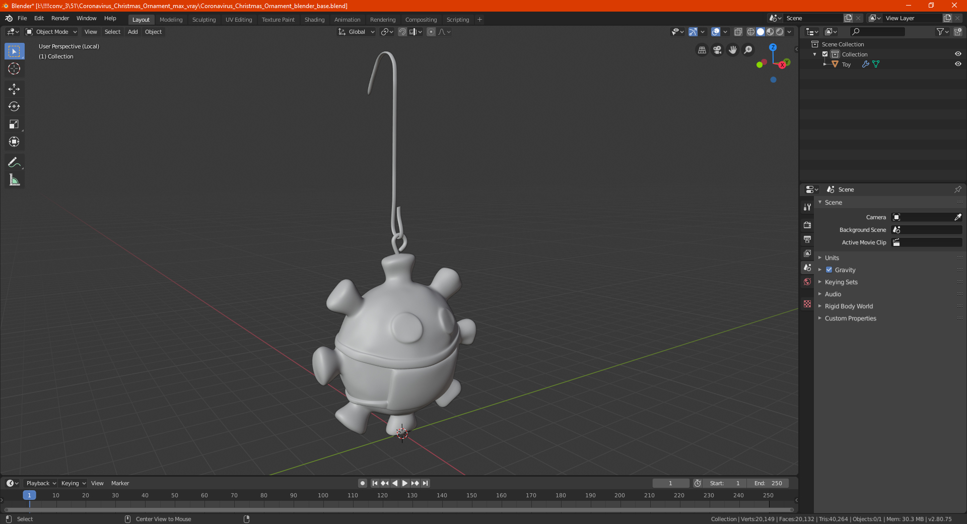 Coronavirus Christmas Ornament is a high quality, photo real 3d model that will enhance detail and realism to any of your rendering projects. The model has a fully textured, detailed design that allows for close-up renders, and was originally modeled in 3ds Max 2020 and rendered with V-Ray. Renders have no postprocessing!
