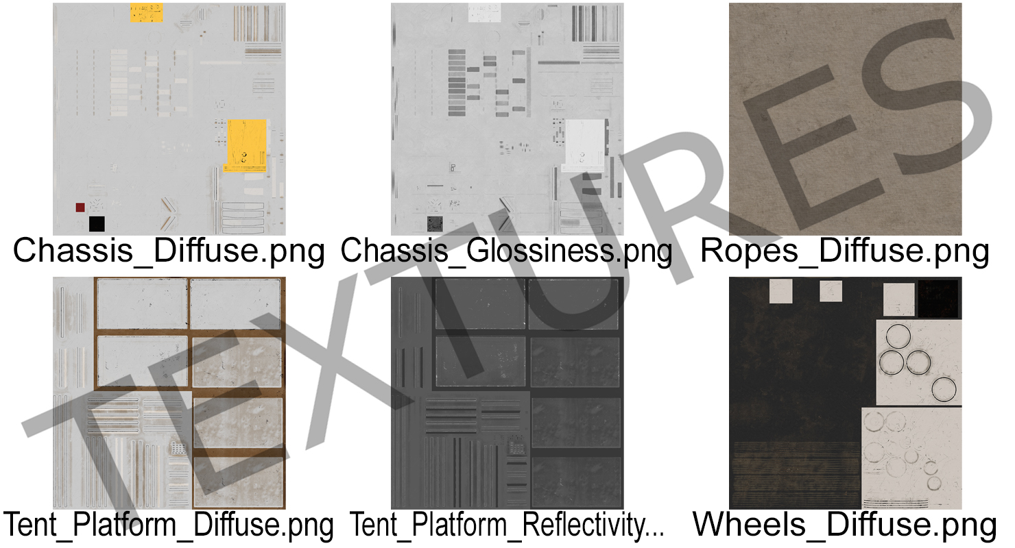 All textures and materials are included and mapped. (All colors can be easily modified.)