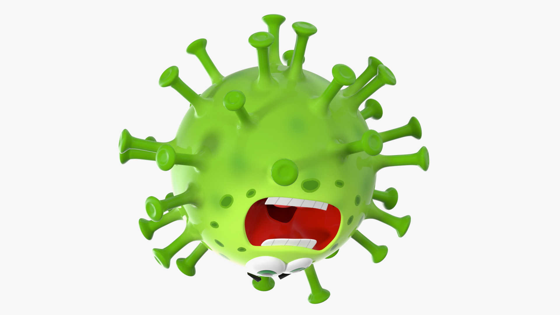 Covid Emoji Scared is a three-dimensional model of a mix of stylized human emotion and visual symbolized representation of a microscope magnified image of a virus cell.
