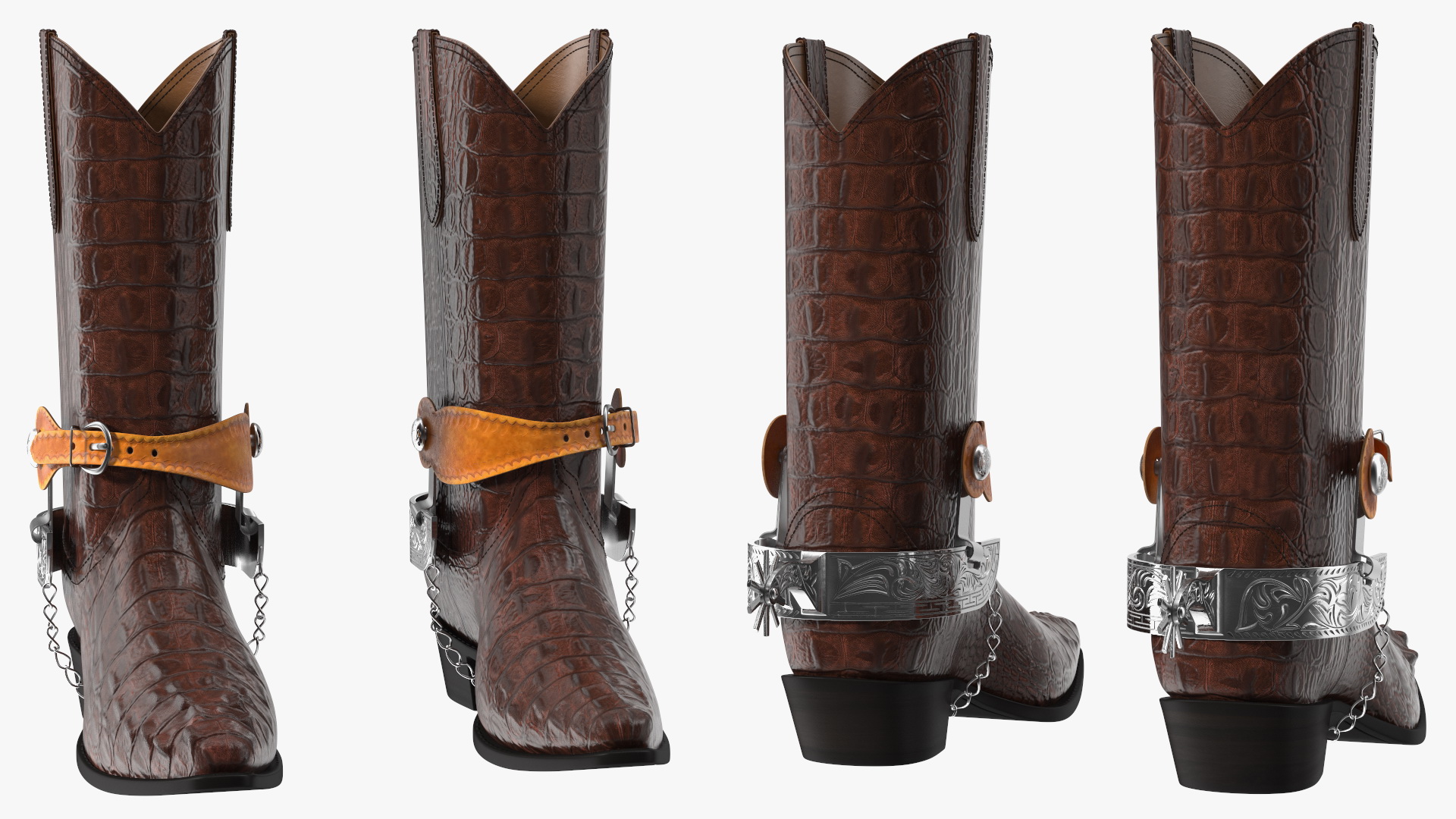Crocodile Cowboy Boots with Spurs is a 3d model of boots are a specific style of riding shoe wear, historically worn by cowboys. They have a high heel that is traditionally made of stacked leather, rounded to pointed toe, high shaft, and no lacing. Cowboy boots are normally made from cowhide leather, but these ones are made from crocodile skin. The cowboy boots evolved to serve the needs of the cowboys, who lead an adventurous life, driving the herds from one place to the other. The contemporary cowboy boots retain this spirit and hence, it gives a rugged yet fashionable appearance to the men. The boots are decorated with spurs on straps used for the purpose of directing a horse or other animal while riding or just as a fashion accessory and without any practical function.