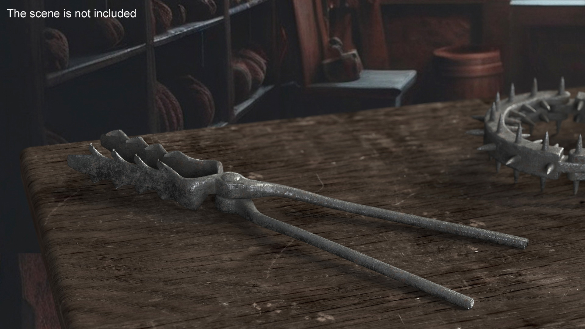 This model faithfully reproduces the details of the crocodile shears, featuring sharp, interlocking metal jaws and a robust handle for applying intense pressure. The serrated edges are meticulously crafted to reflect the horrifying design intended to clamp down and tear flesh. This historical instrument is recreated with accuracy to serve as a stark representation of medieval torture techniques. It is perfect for educational contexts, allowing a detailed examination of historical punitive devices and for use in visualizations of medieval scenes and historical storytelling.