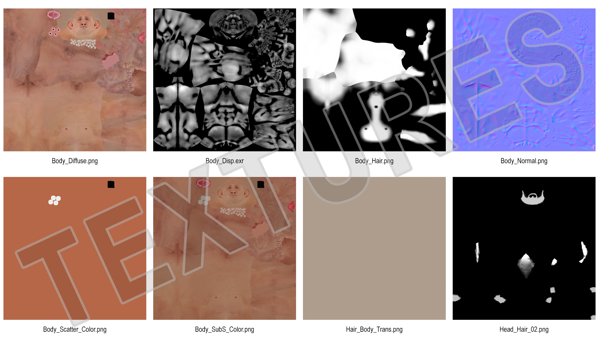 Cromagnon Man Rigged Fur has a 3dsmax Fur modifier, hair customizable (hair count, hair segments, hair color, root size, tip size, etc).