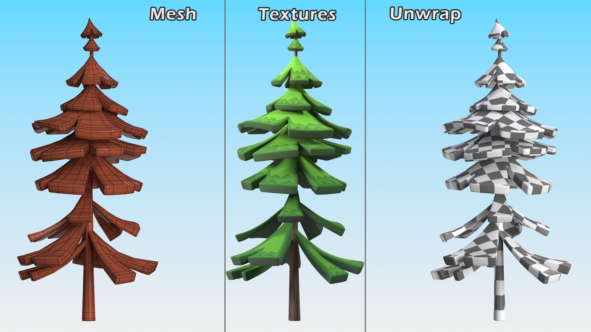 Crooked Fur Tree Cartoon Handpaint Texture is a three-dimensional model of cartoon style (primitive, casual or simplified style prop) fir tree (well known evergreen coniferous tree which belonging to the genus Abies in the family Pinaceae), and which is a part of landsсape or cartoon environment.