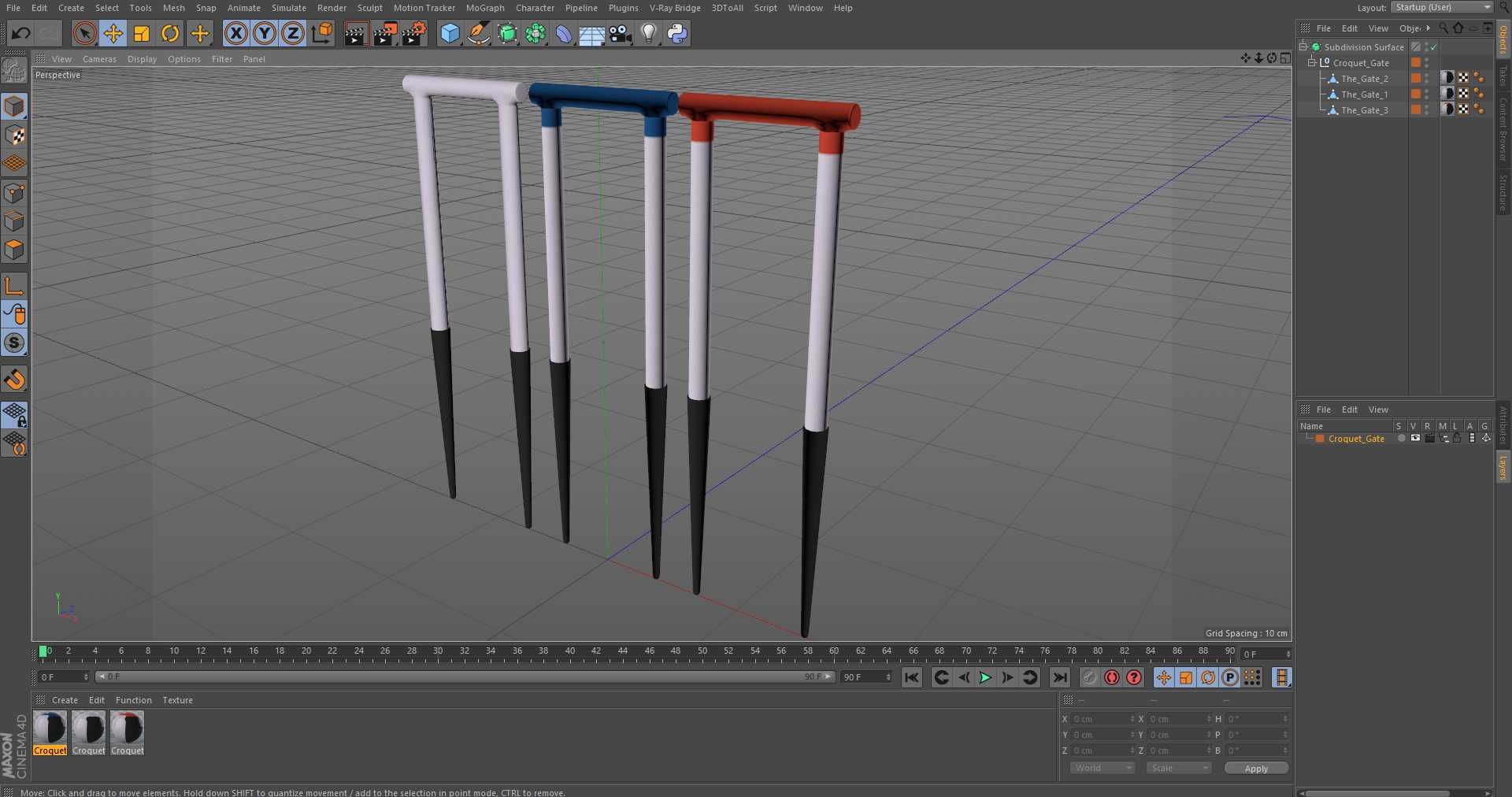 Croquet Gate is a three-dimensional model of set of croquet gate items which are metal U-shaped gate (wicket) implements, which can be pushed into ground.