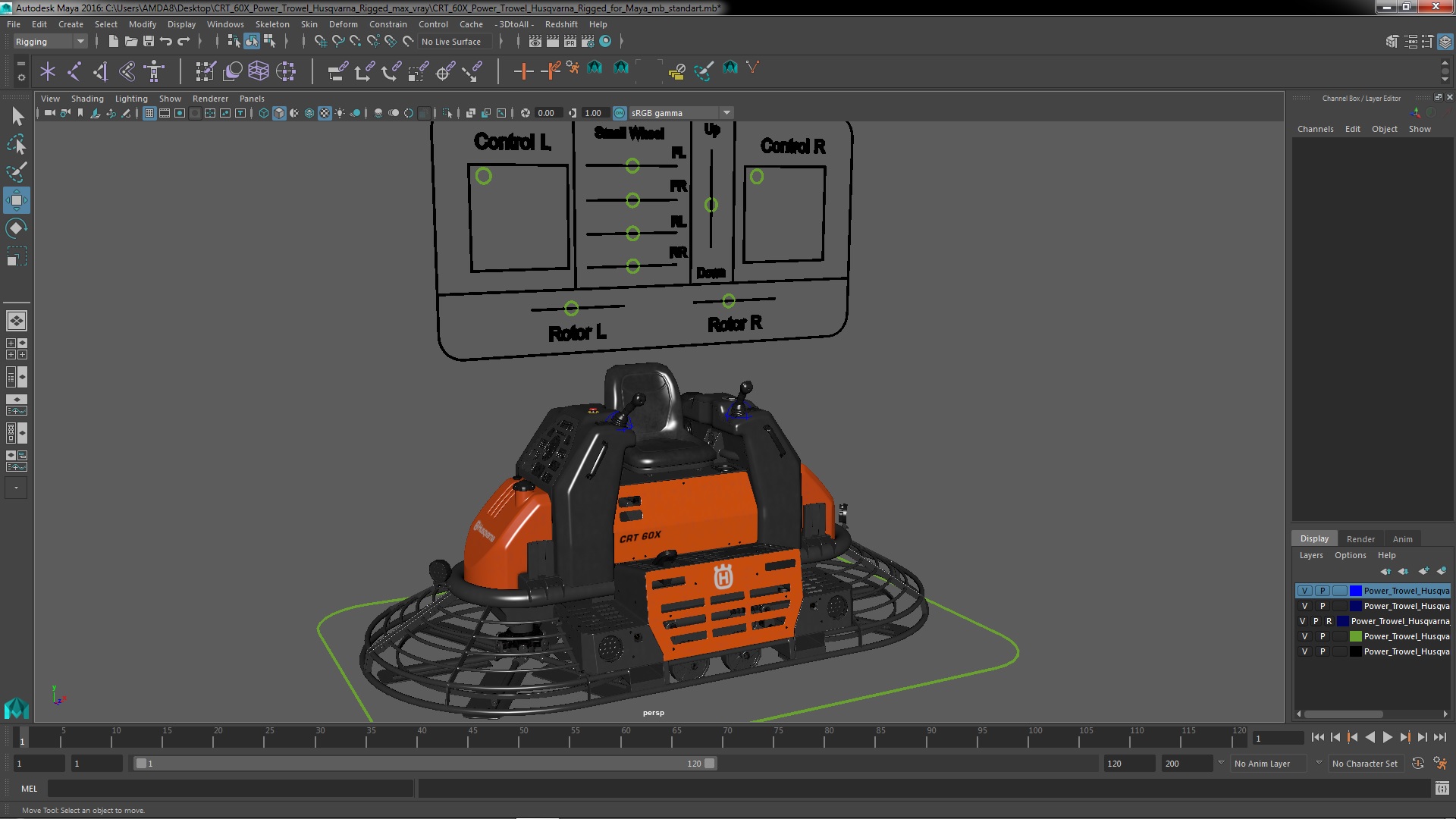 CRT 60X Power Trowel Husqvarna Rigged for Maya is fully rigged and is ready to be animated in Maya. You can easily position it the way you need or animate it the way your project requires. See the screenshots to get an idea of how rigging works. The pose of the model on the render images is an example and can be recreated using rig, it is not initially included into the product.