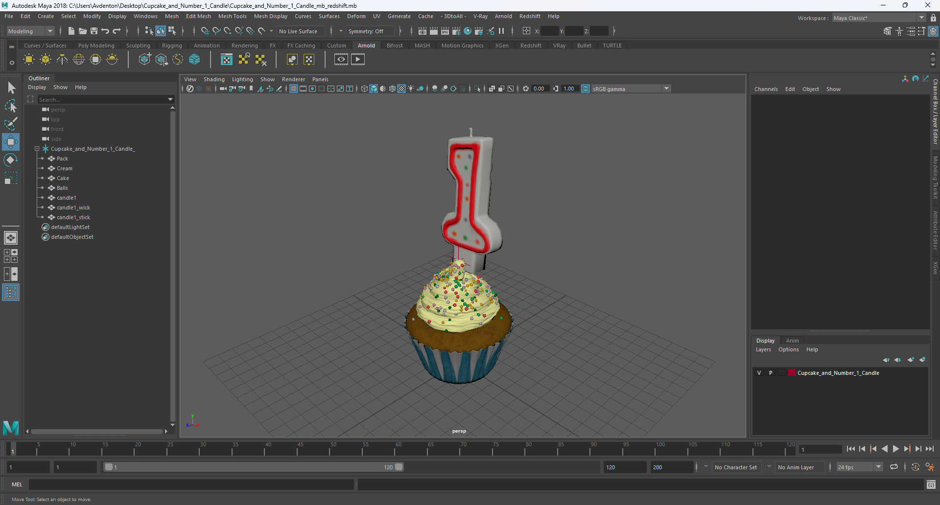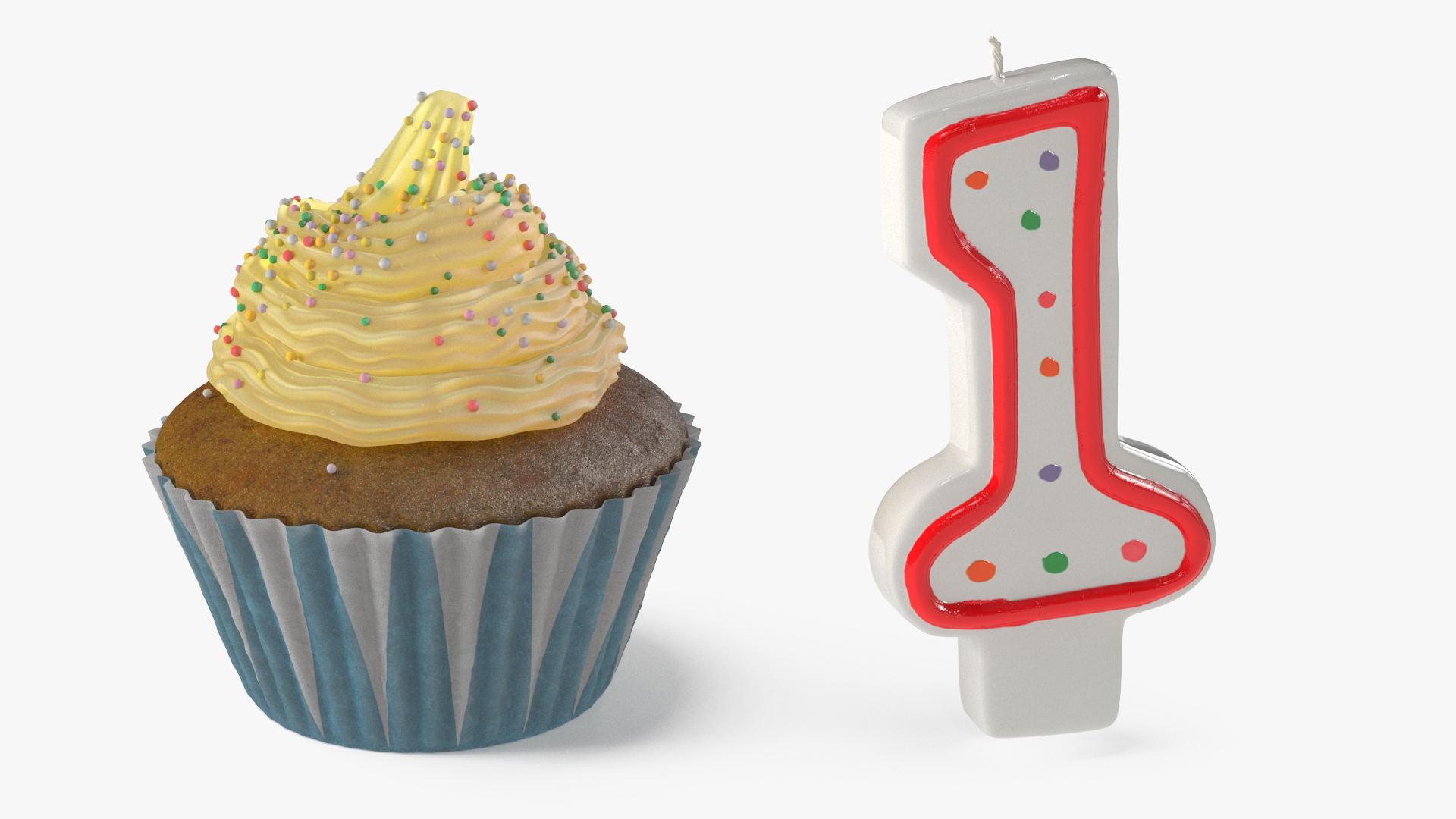 Cupcake and Number 1 Candle is a three-dimensional model of classic cupcake (birthday cupcake and candle set), that is a birthday candle with a topped dessert with smooth, whipped cream frosting.