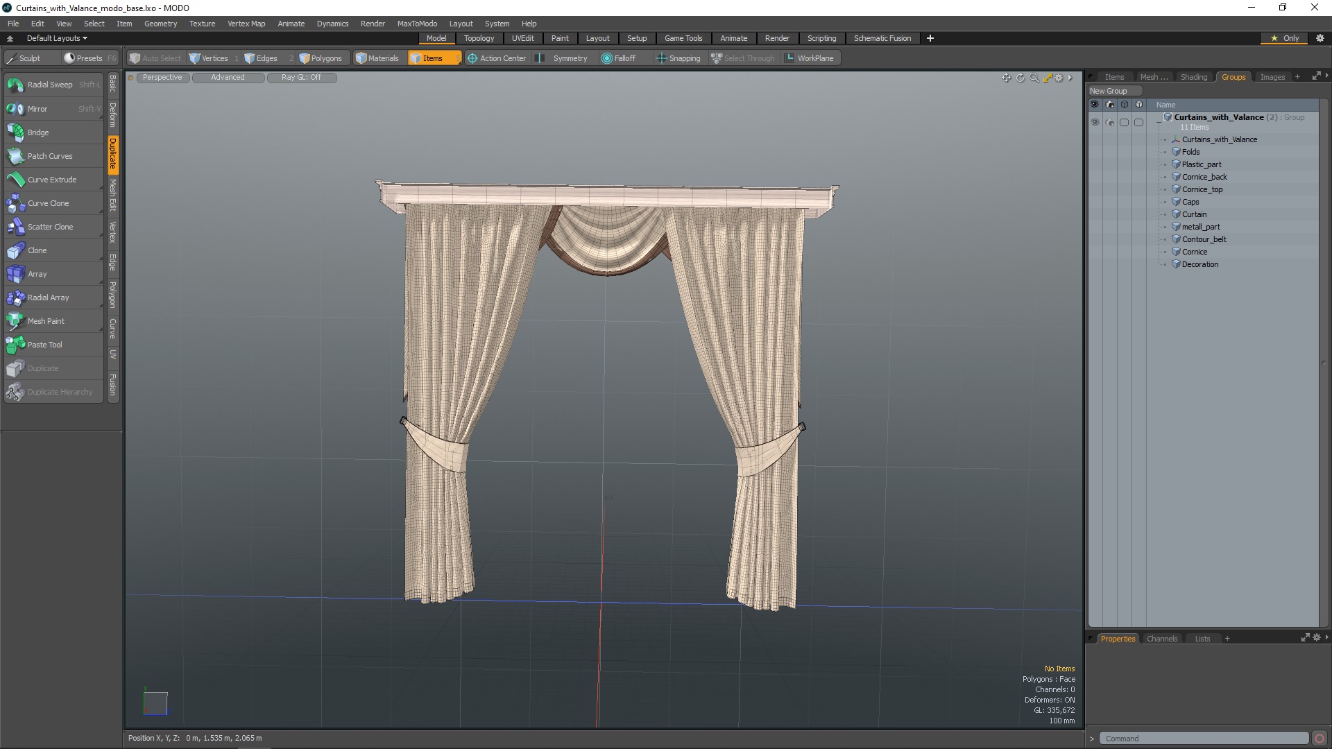 Curtains with Valance is a three-dimensional model of window drapery that can be used to cover windows, block out light, enhance the appearance of a room, provide privacy, and more.
