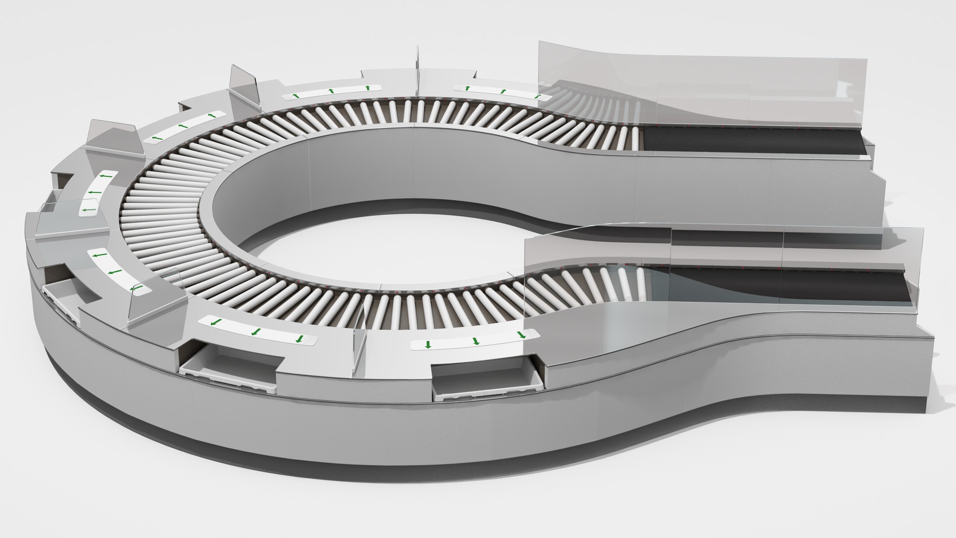 The curved roller conveyor a part of industrial machinery (manufacturing factory technology), goods transporting system, post delivery systems, food production industry, supermarket equipment, or airport departure terminal.