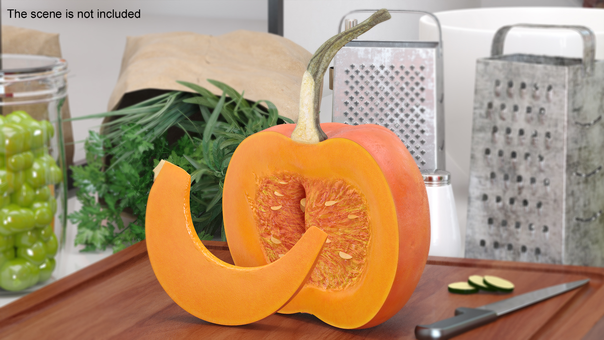 Cut Pumpkin with Slice is a 3d model of orange vegetable that can be cooked and used in various dishes or desserts due to their sweet and nutty flavor.