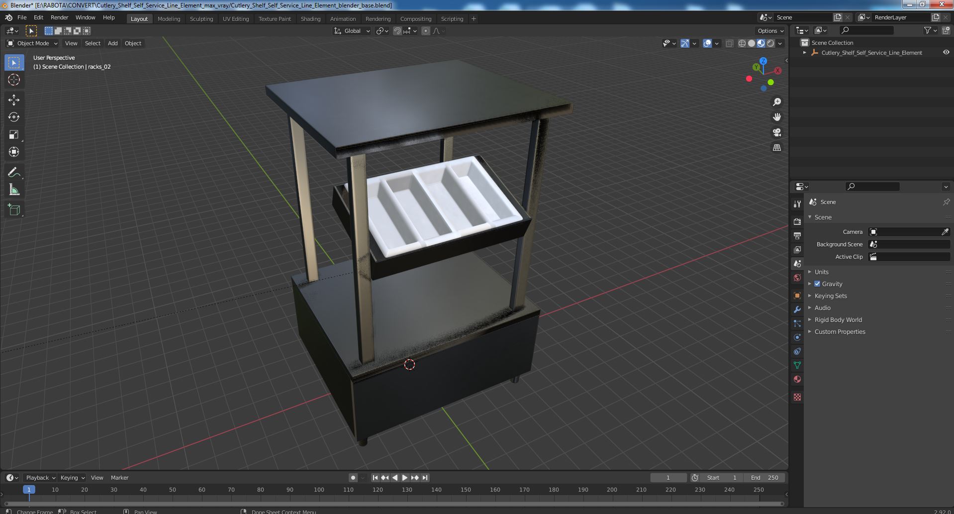 Cutlery Shelf Self Service Line Element is a high quality, photo real 3d model that will enhance detail and realism to any of your rendering projects. The model has a fully textured, detailed design that allows for close-up renders, and was originally modeled in 3ds Max 2020 and rendered with V-Ray. Renders have no postprocessing!