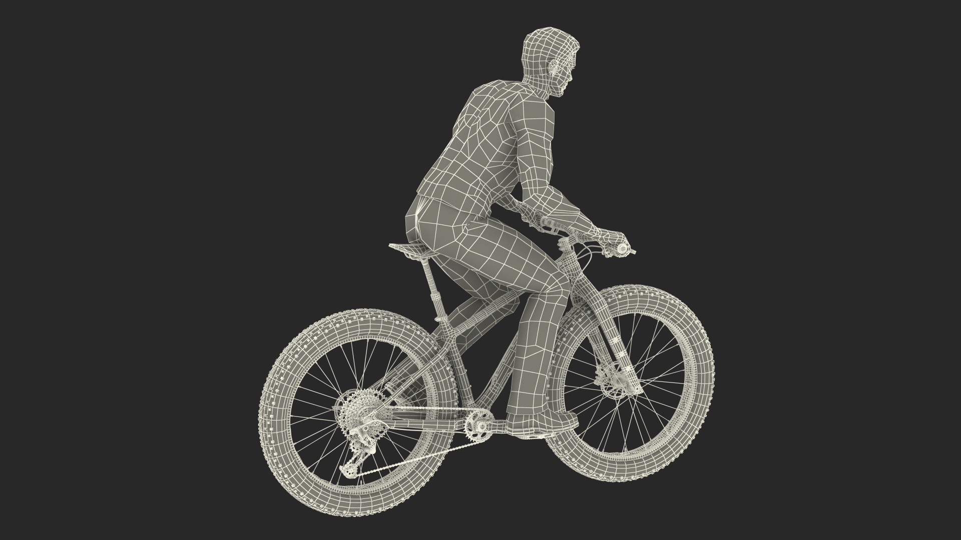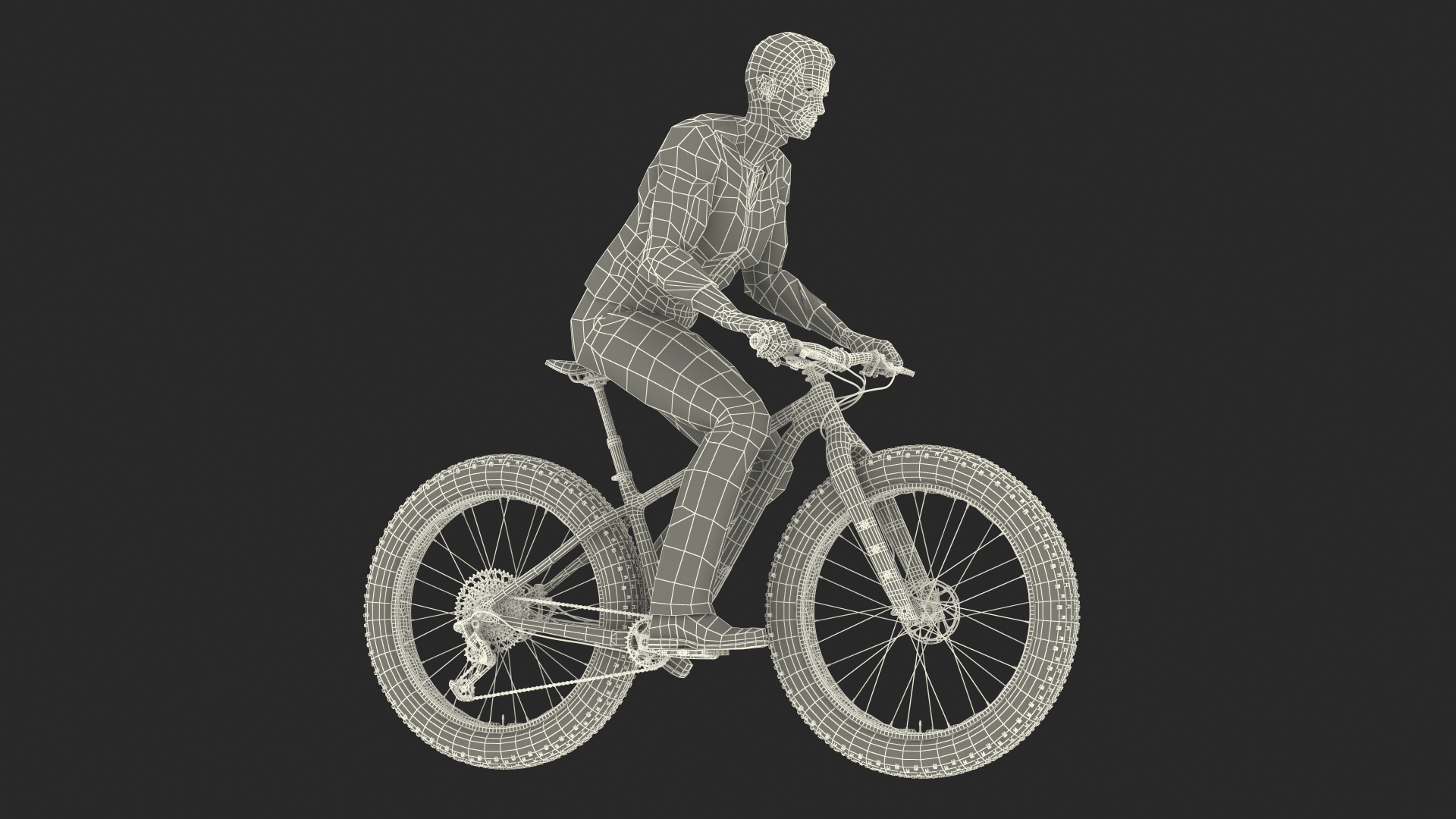 Cyclist on Trek Fat Bike is a three-dimensional model of male rider (man athlete) with a modern carbon fatbike (fat bike) that is an off-road bicycle with oversized tires and wide tire rims for riding on soft, unstable terrain.