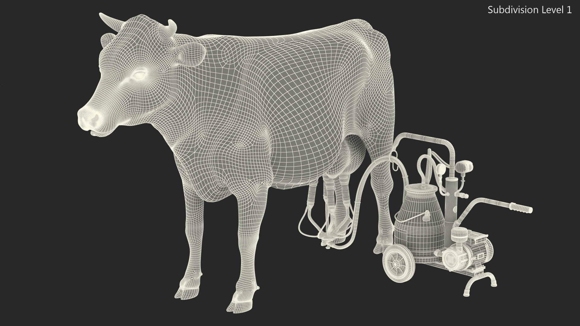 Dairy Cow with Milking Machine Fur is a high quality, photo real 3d model that will enhance detail and realism to any of your rendering projects. The model has a fully textured, detailed design that allows for close-up renders, and was originally modeled in 3ds Max 2020 and rendered with V-Ray. Renders have no postprocessing!