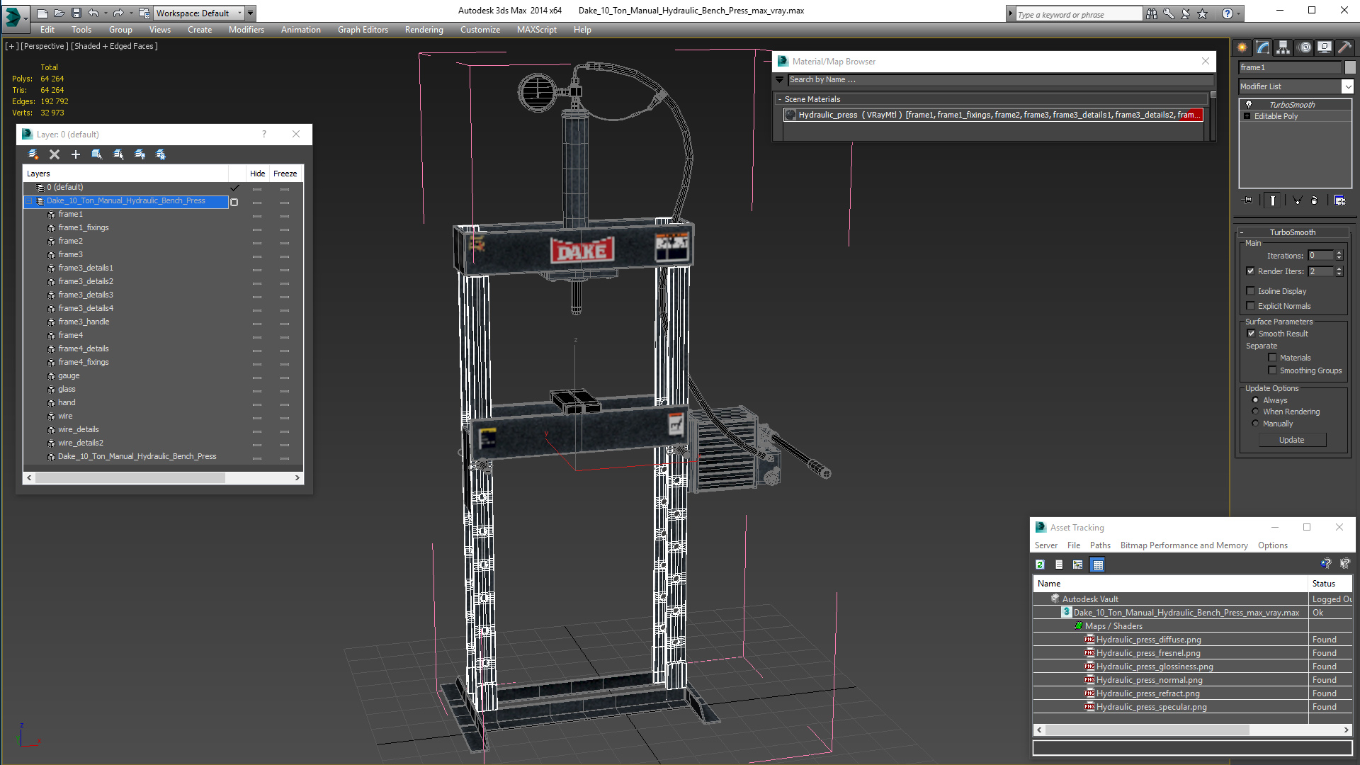 Dake 10 Ton Manual Hydraulic Bench Press is a high quality, photo real 3d model that will enhance detail and realism to any of your rendering projects. The model has a fully textured, detailed design that allows for close-up renders, and was originally modeled in 3ds Max 2020 and rendered with V-Ray. Renders have no postprocessing!