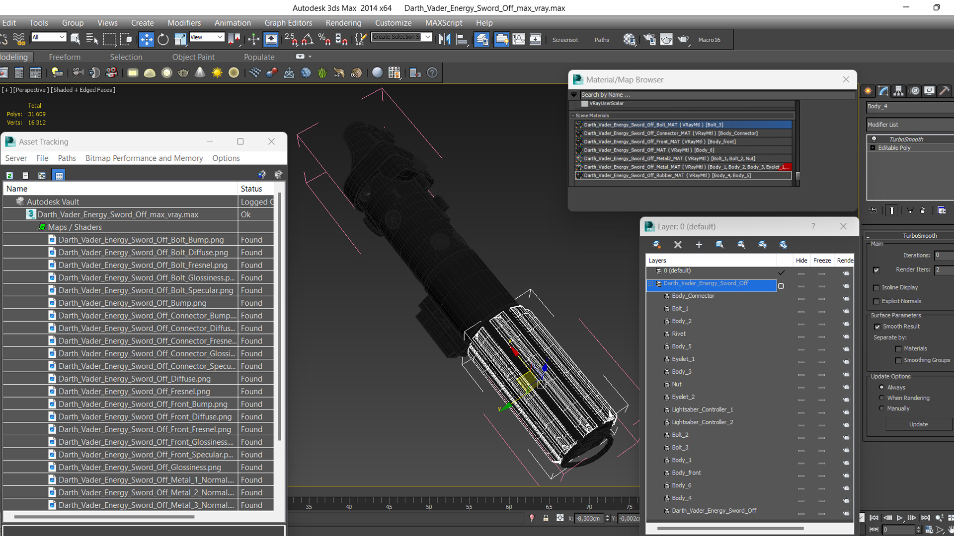 Darth Vader Energy Sword Off is a high quality, photo real 3d model that will enhance detail and realism to any of your rendering projects. The model has a fully textured, detailed design that allows for close-up renders, and was originally modeled in 3ds Max 2020 and rendered with V-Ray. Renders have no postprocessing!