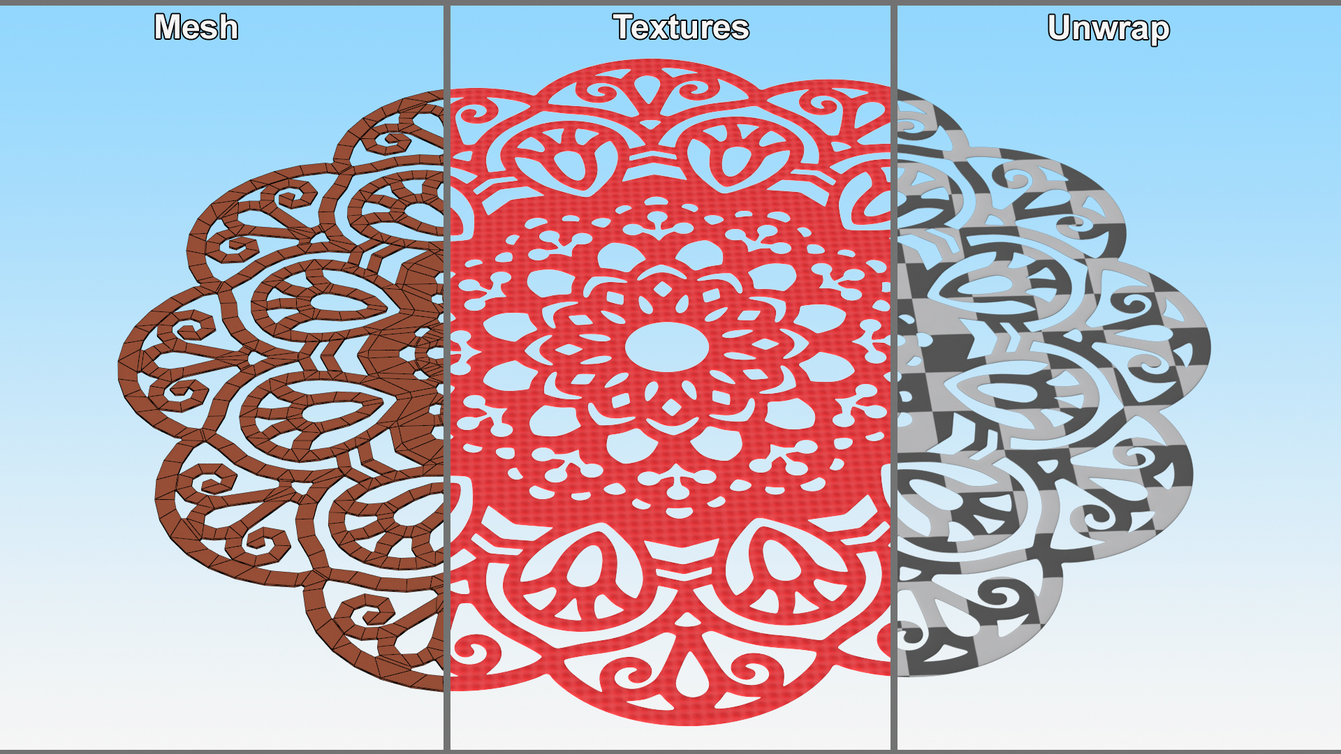 Decorative Round Lace Paper Doilie Red is a high quality, photo real 3d model that will enhance detail and realism to any of your rendering projects. The model has a fully textured, detailed design that allows for close-up renders, and was originally modeled in 3ds Max 2020 and rendered with V-Ray. Renders have no postprocessing!