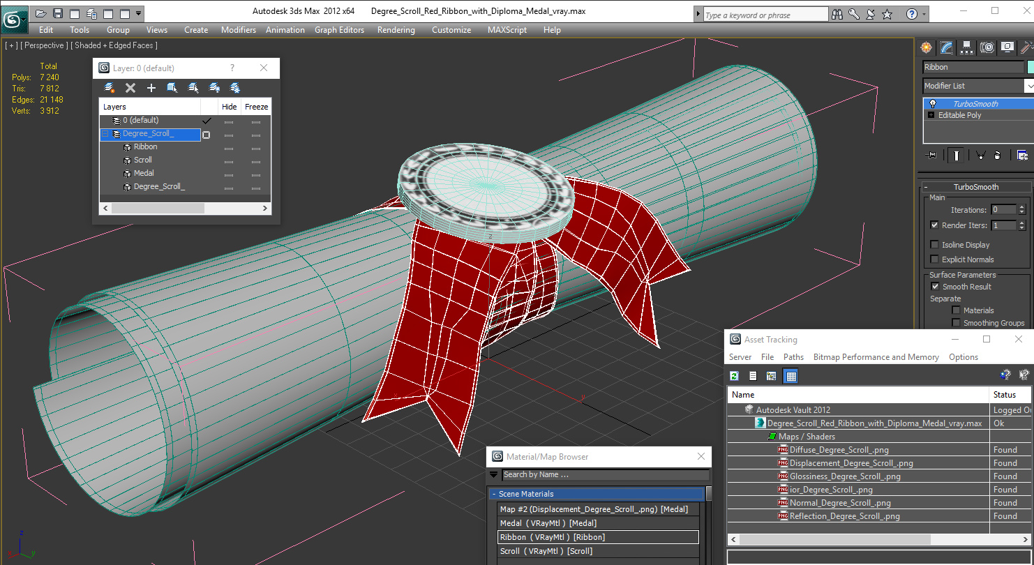 Degree Scroll Red Ribbon with Diploma Medal is a high quality, photo real 3d model that will enhance detail and realism to any of your rendering projects. The model has a fully textured, detailed design that allows for close-up renders, and was originally modeled in 3ds Max 2020 and rendered with V-Ray. Renders have no postprocessing!